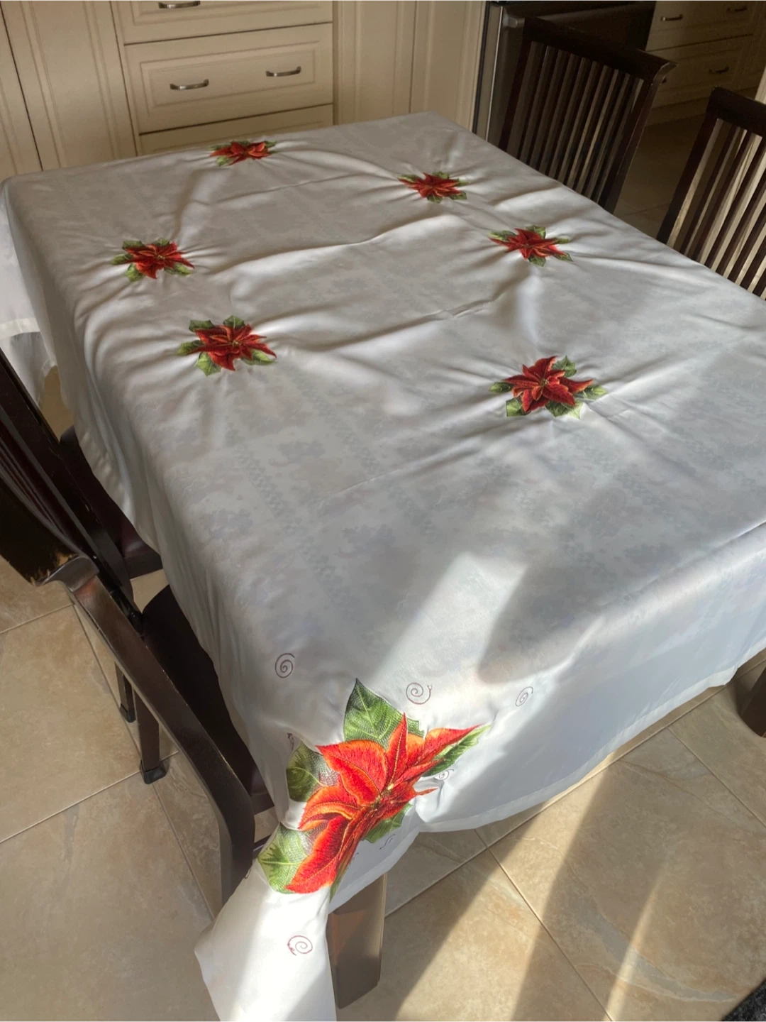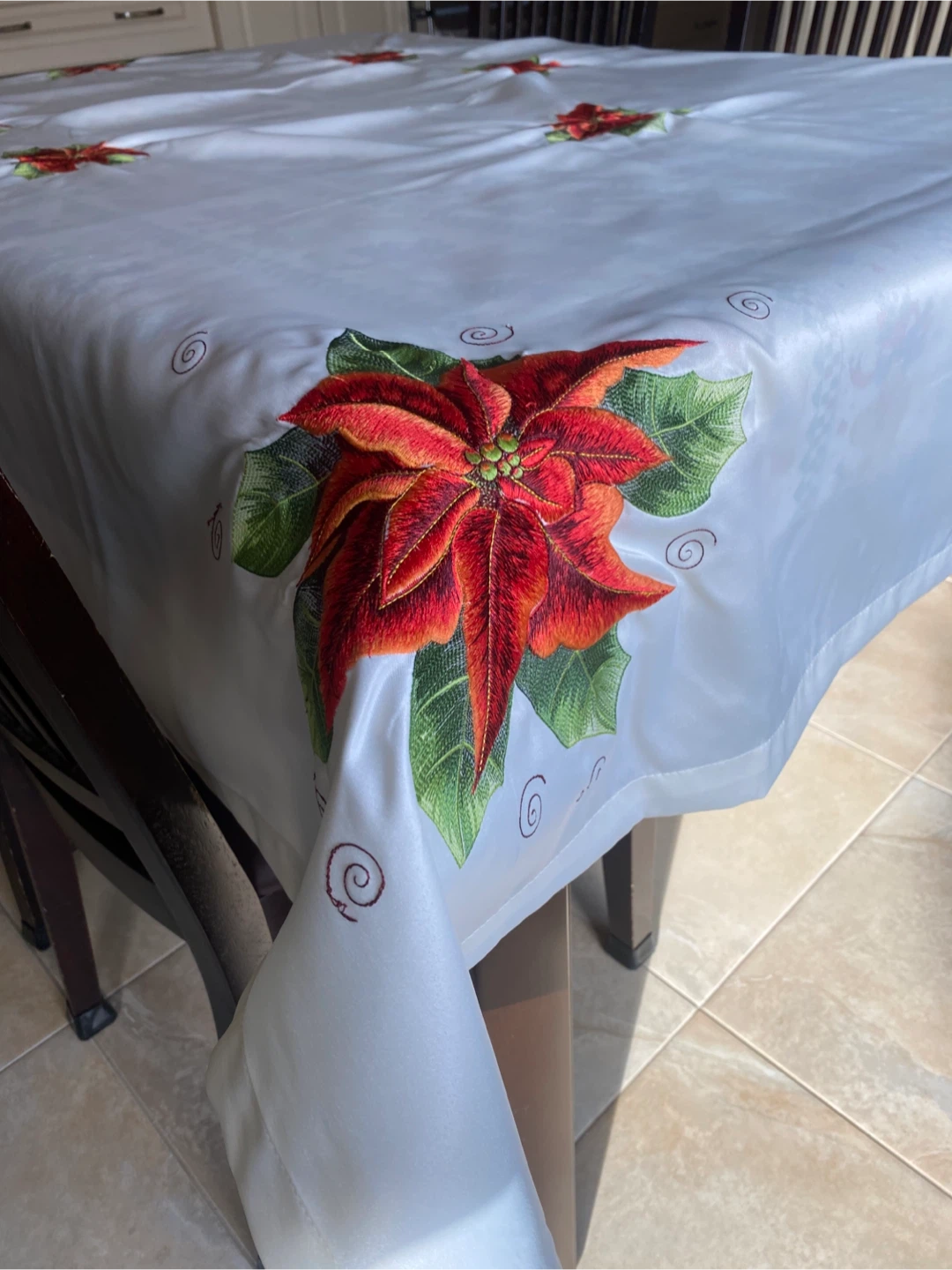 Beautiful poinsettia embroidered tablecloth, perfect for adding a festive touch to your dining room.
