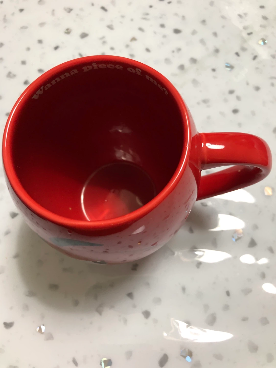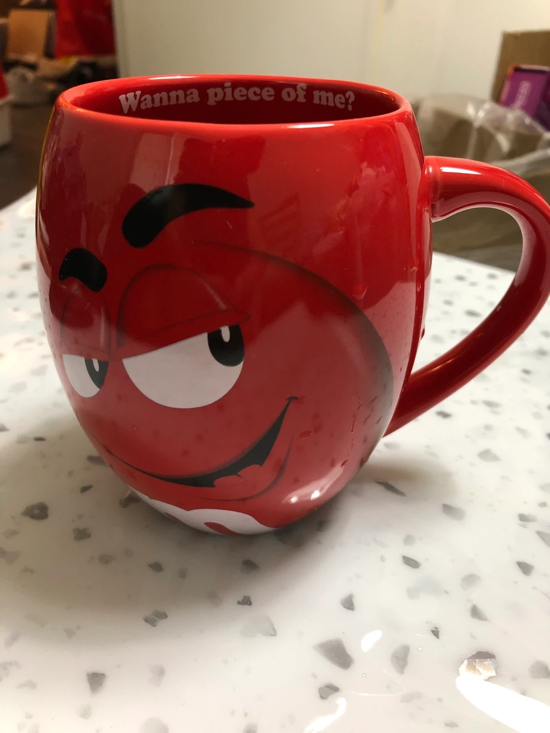 Here's a fun M&M's mug featuring the Red character! It says "Wanna piece of me?" on the inside rim and has "RED!" printed on the back