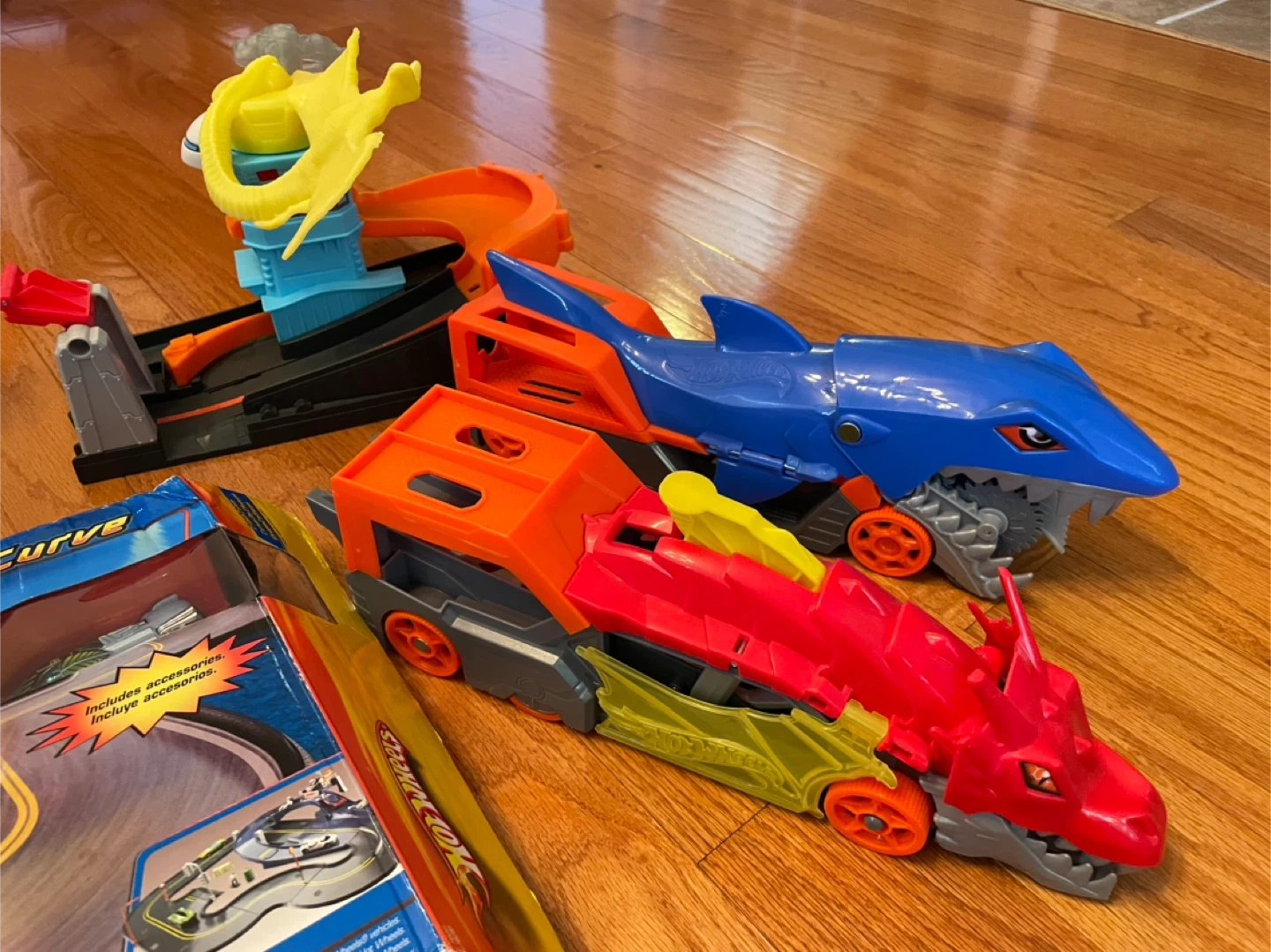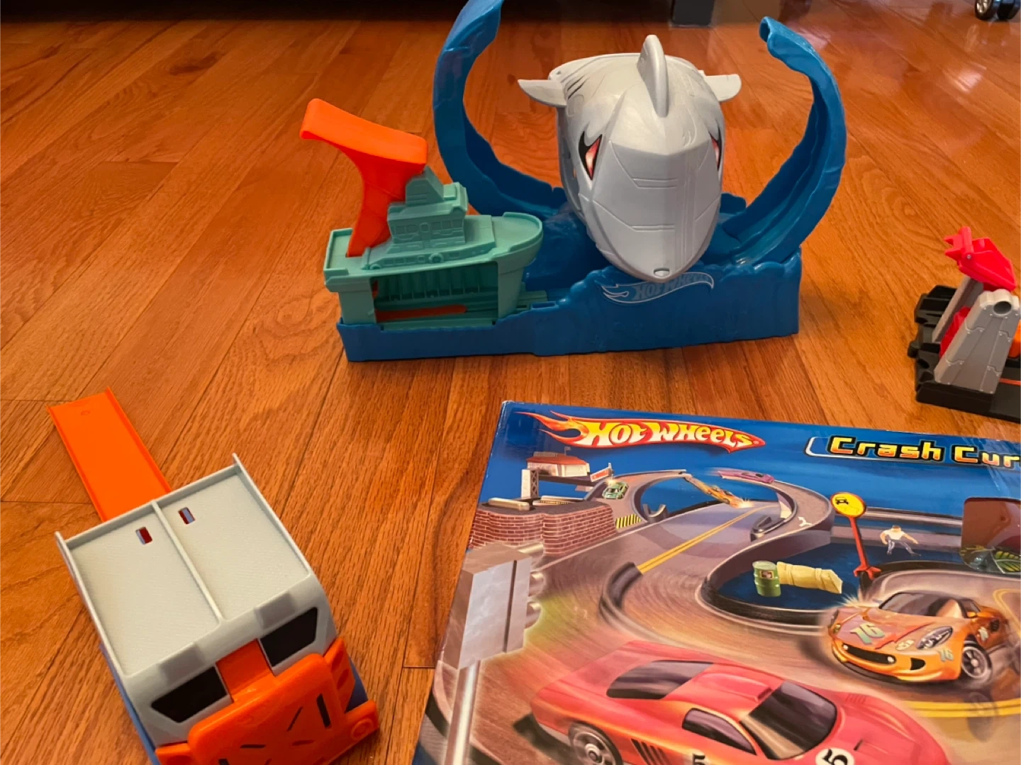 76Hot Wheels Dragon Launch and Shark Chomp Transporters – set of 2 • Regular dragons spit fire, but the Hot Wheels City Dragon spits Hot Wheels vehicles out of its mouth for awesome fun and big-time excitement. • The super-cool shark-inspired hauler gobbles up cars and stores them in its belly for a unique and fun way to transport and store Hot Wheels vehicles. Hot Wheels Ptero-Port Attack and Transport Plane and Truck #GBF94 Ptero-Port Attack: From the Hot Wheels City sets. Escape the flying pterodactyl at the airport. Hot Wheels Crash Curve #69554 This set was recently assembled (from new) and stickers applied. But never played. Box is in fair condition, but the track and car are like-new. From the Hot Wheels World sets. (out of print, set no longer available) Pick-up in Oakville. Just north of the QEW off Bronte.