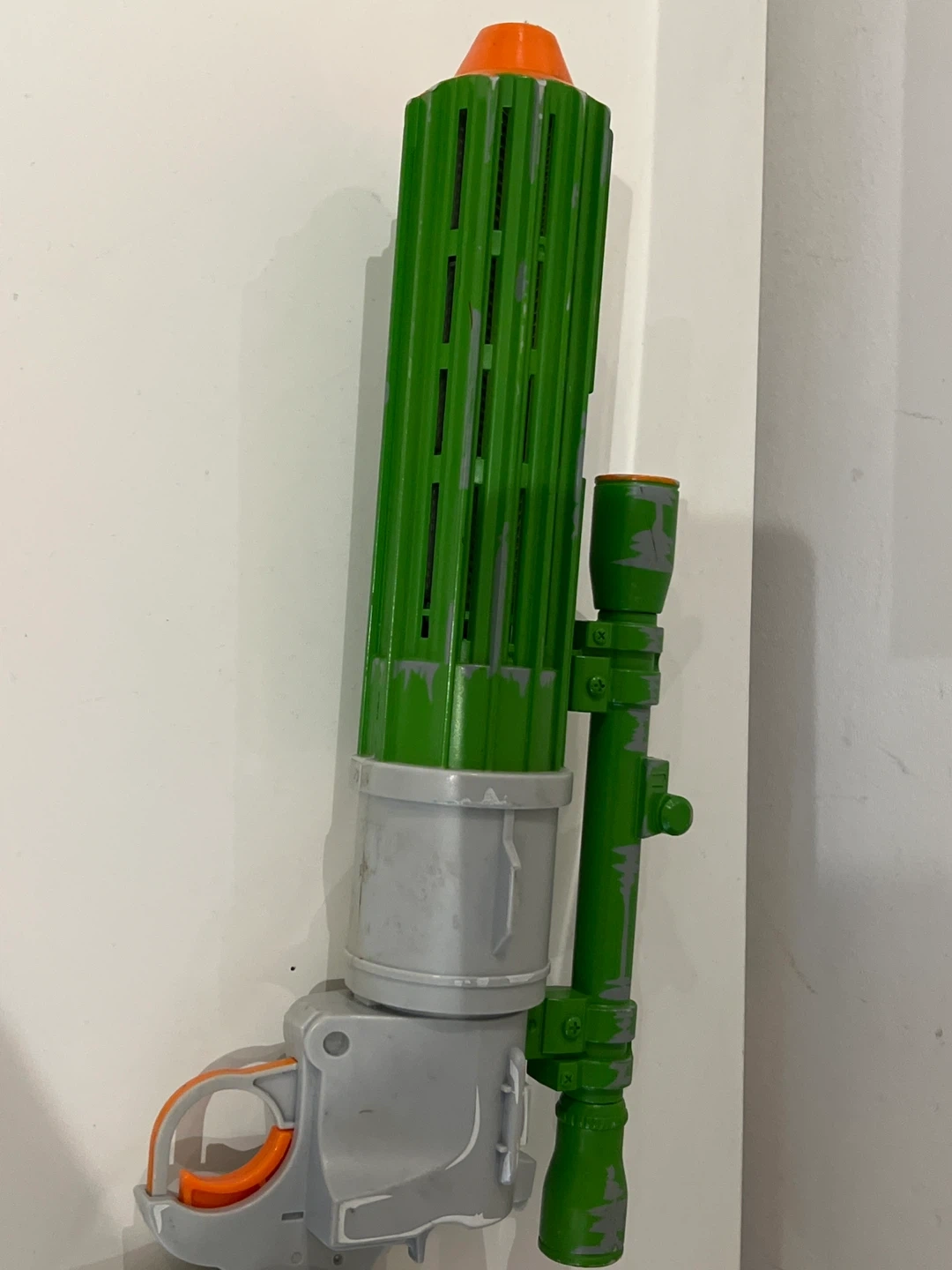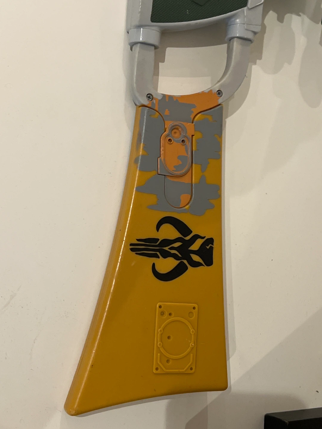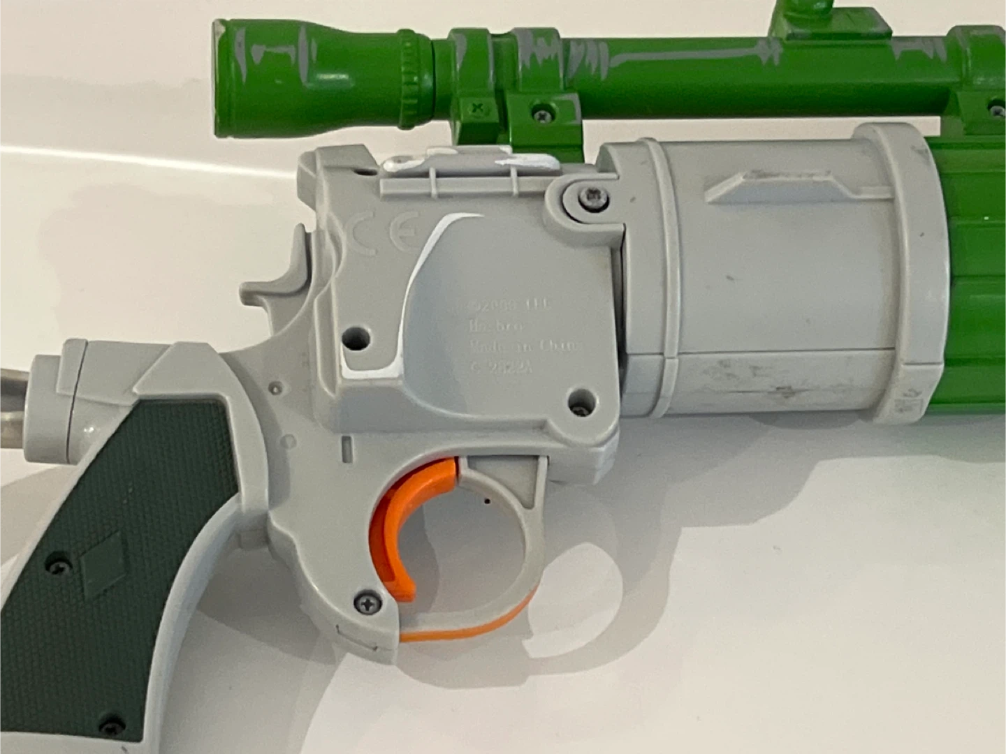 Selling a Star Wars Boba Fett blaster toy. It's in used condition, with some wear and tear as seen in the photos. Great for any Star Wars fan or collector!