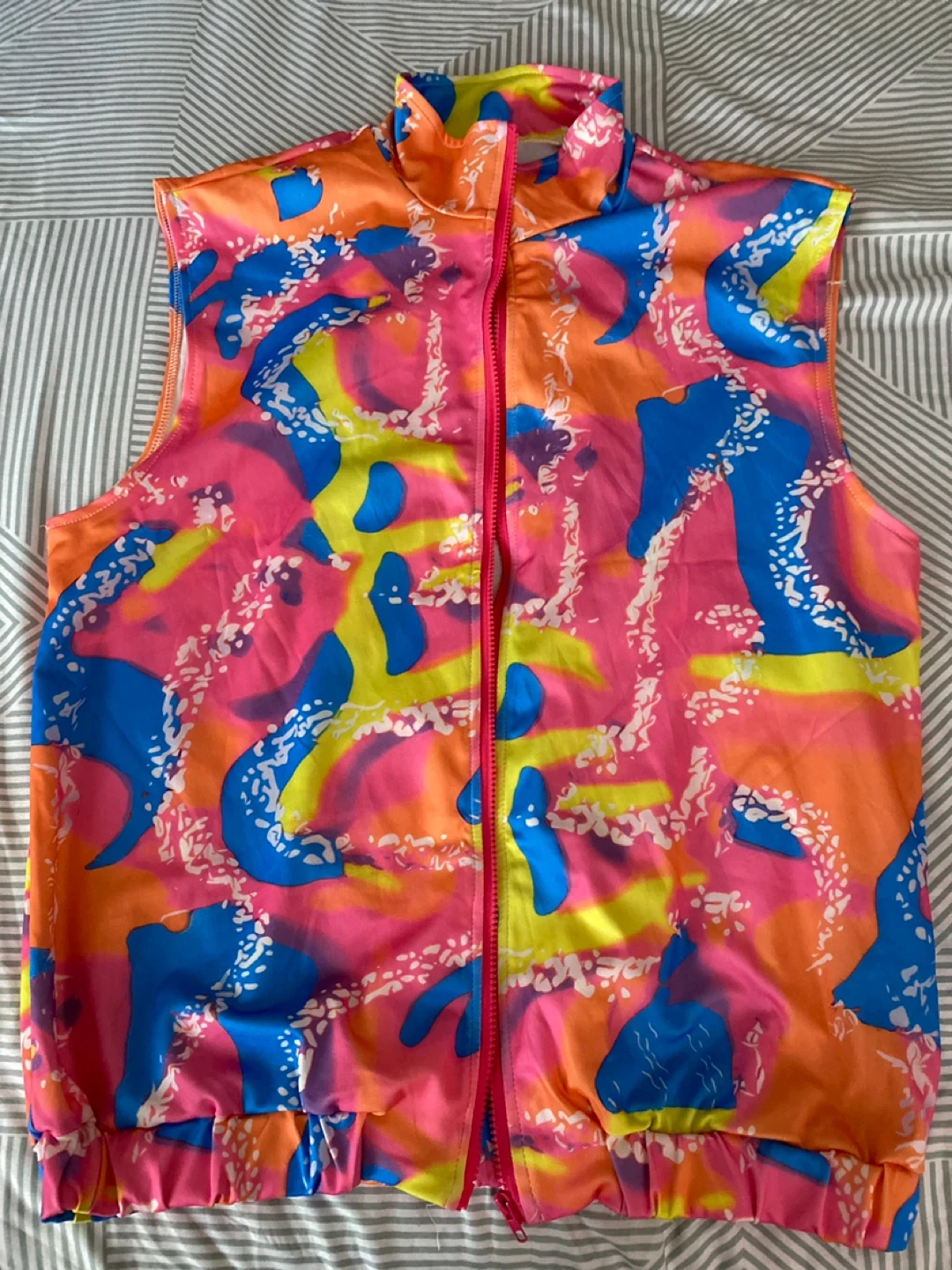 Here's a fun and colourful vest! It features a vibrant pattern with shades of pink, orange, yellow, and blue. It's in great condition and ready to add a pop of colour to your wardrobe
