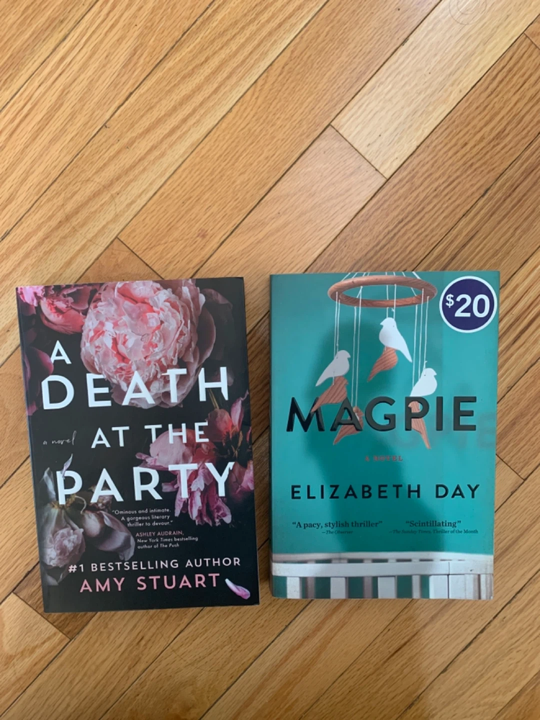 Selling two thriller novels: "A Death at the Party" by Amy Stuart and "Magpie" by Elizabeth Day