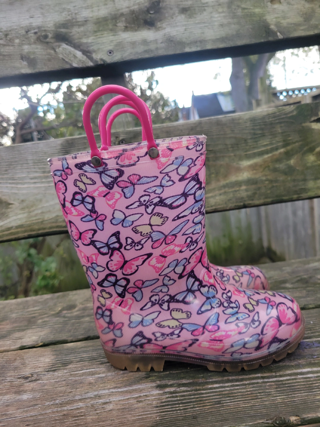 These adorable pink rain boots are perfect for your little one! They feature a fun butterfly pattern and handy handles for easy on and off. Great for splashing in puddles! SIZE 11 Girls