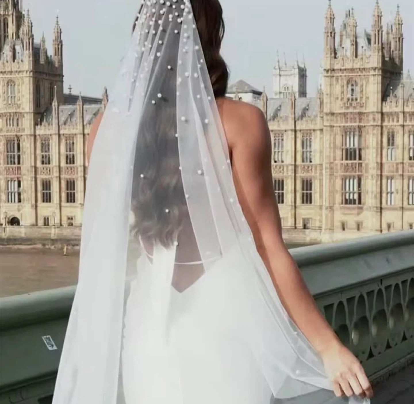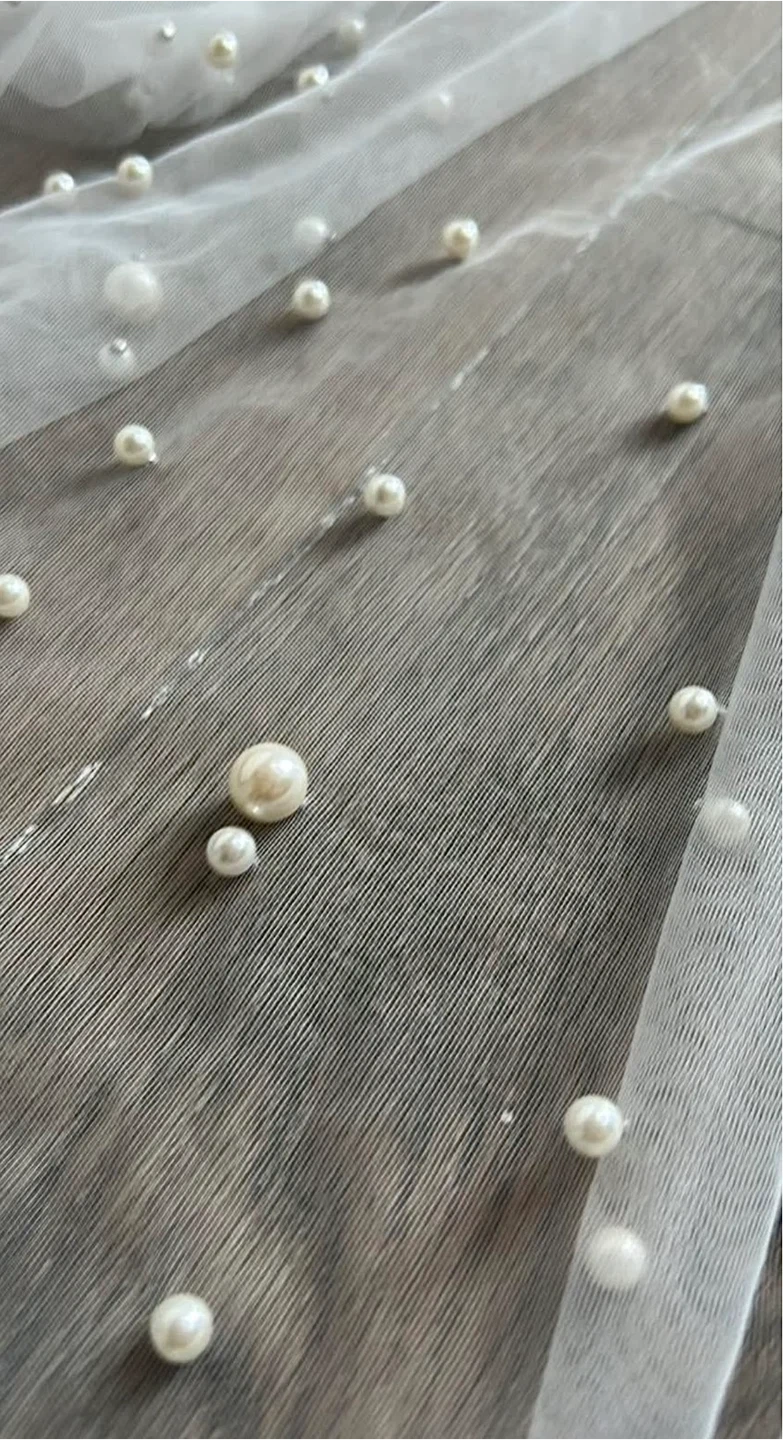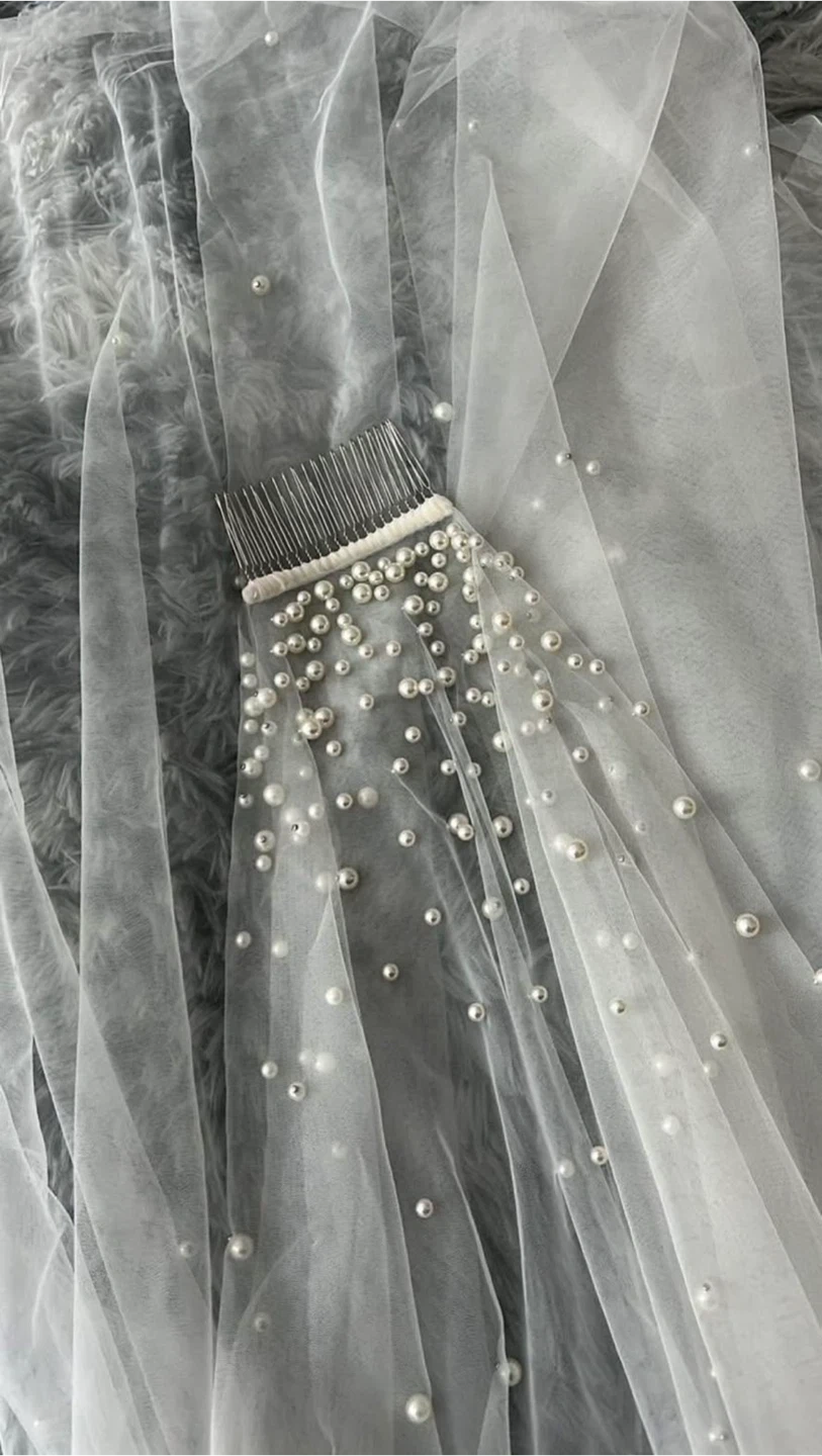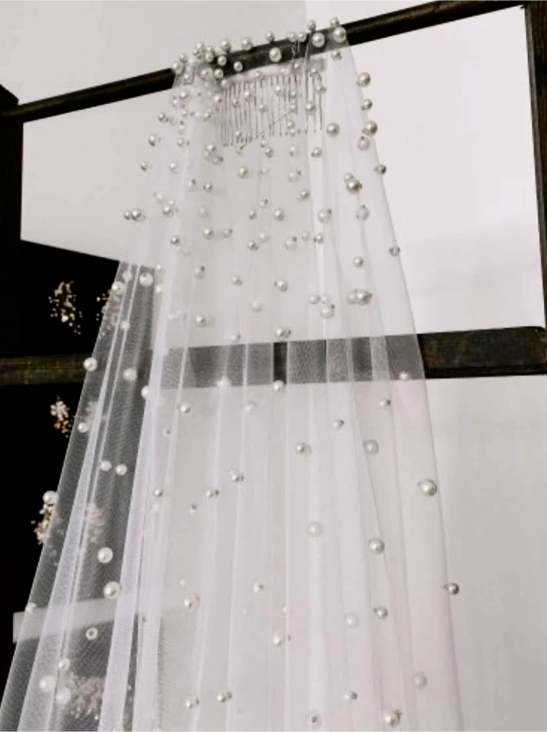 90Beautiful white wedding veil adorned with pearls. It's in great condition and ready to make someone's special day even more magical! The pearls are delicately placed throughout the veil, adding a touch of elegance and sophistication