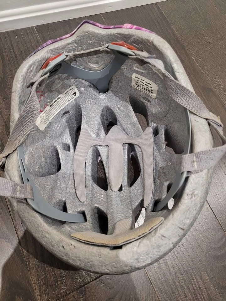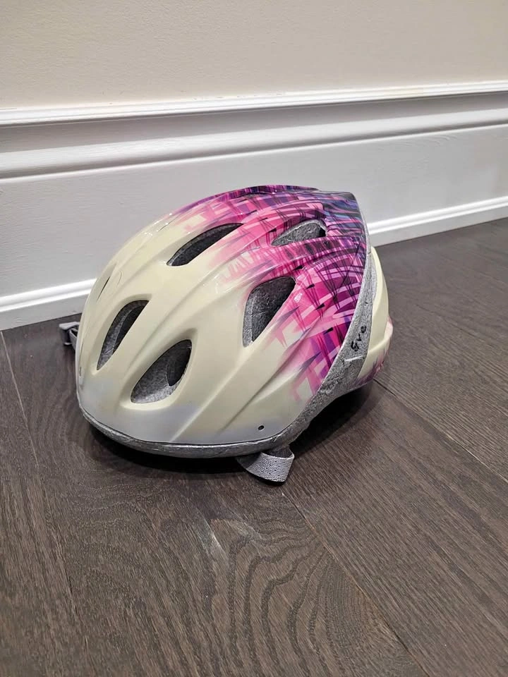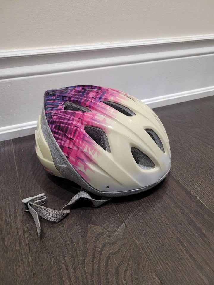 20Cute and sturdy bike helmet for girls in pink and white! Perfect for biking, scootering, or outdoor play. Adjustable straps ensure a safe and comfy fit. Lightly used and still in great condition. Kids size, adjustable fit Comfortable and protective Ideal for biking or outdoor activities