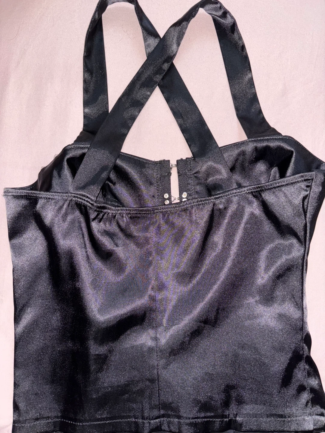 Frederick's of Hollywood corset top in black! It features a hook and eye closure down the front and cross-over straps. Perfect for a night out!