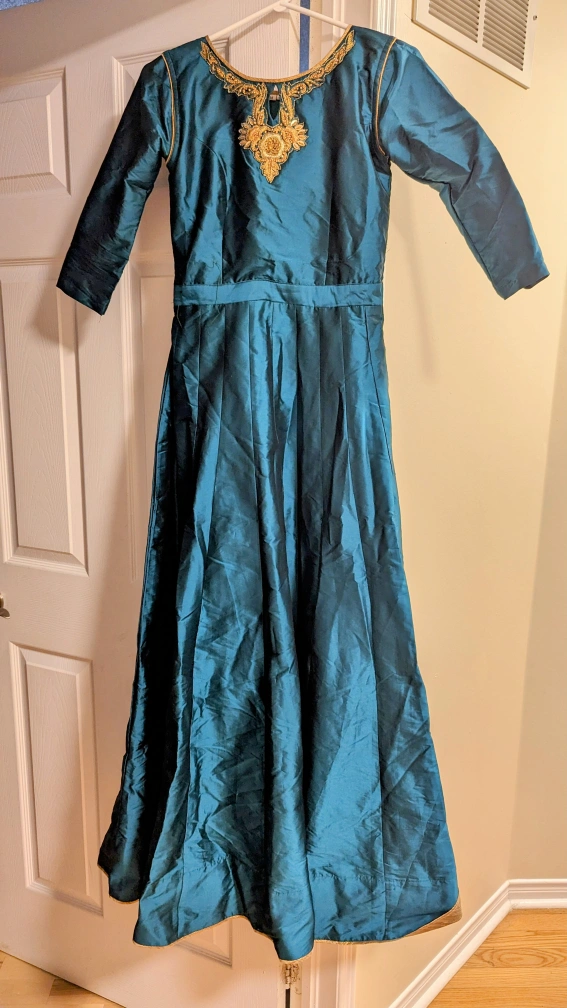 Selling a beautiful teal maxi dress Dark Green with intricate gold detailing around the neckline. It's in great condition and would be perfect for a special occasion or event. The dress has long sleeves and a flattering silhouette. Feel free to ask any questions!