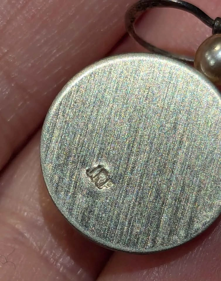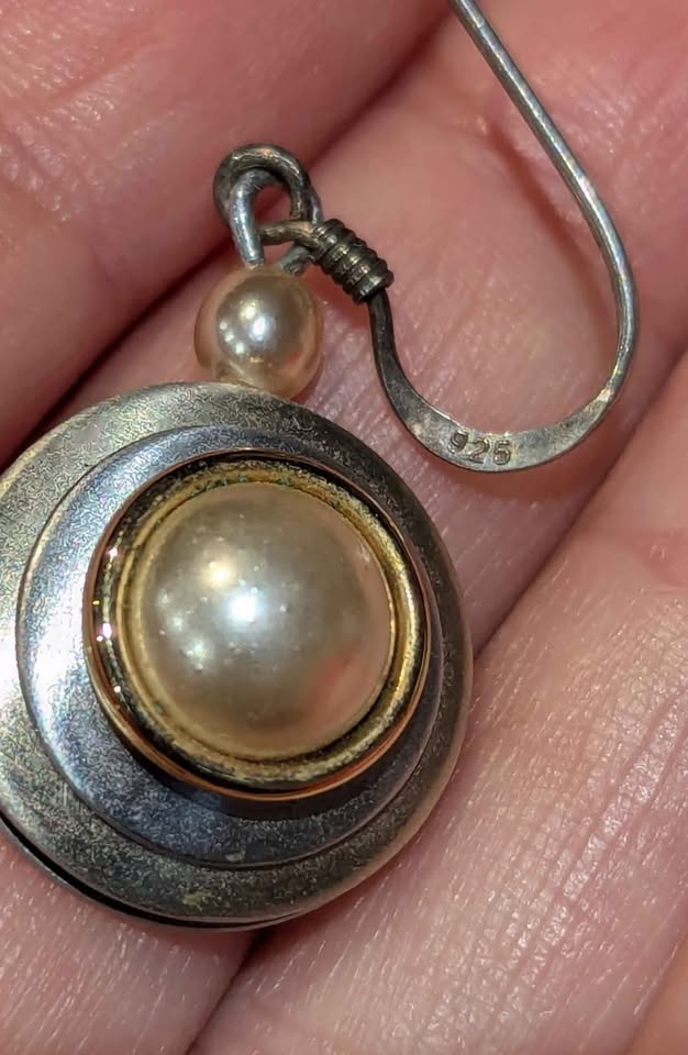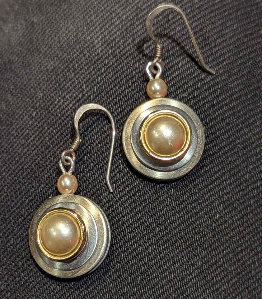 Beautiful vintage artisan earrings in sterling silver with gold accent and luminous pearl centers.