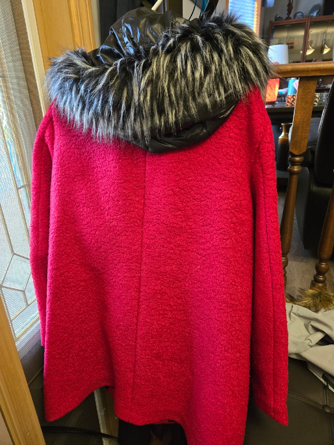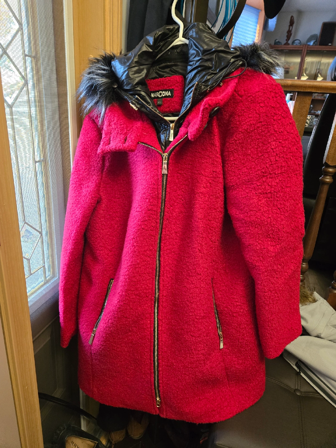 Cozy up this winter with this vibrant red Marcona coat! It's a size O/L and features a stylish faux fur trim on the hood. The shell is 100% nylon and the lining is 100% polyester, so it's sure to keep you warm and dry!
