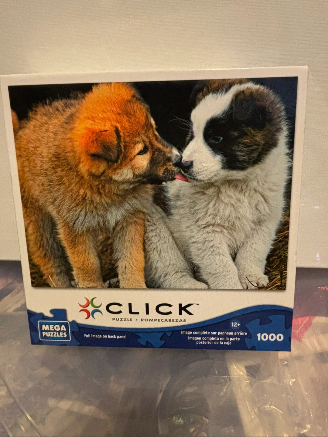 Selling a 1000 piece Click Mega Puzzle. The image on the puzzle is two puppies. It is recommended for ages 12+. New, bag sealed
