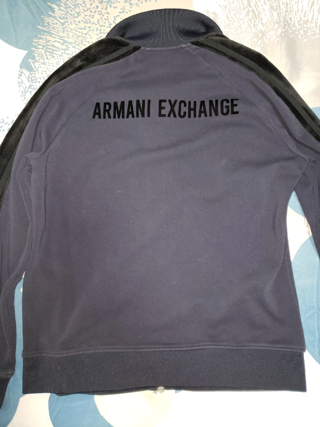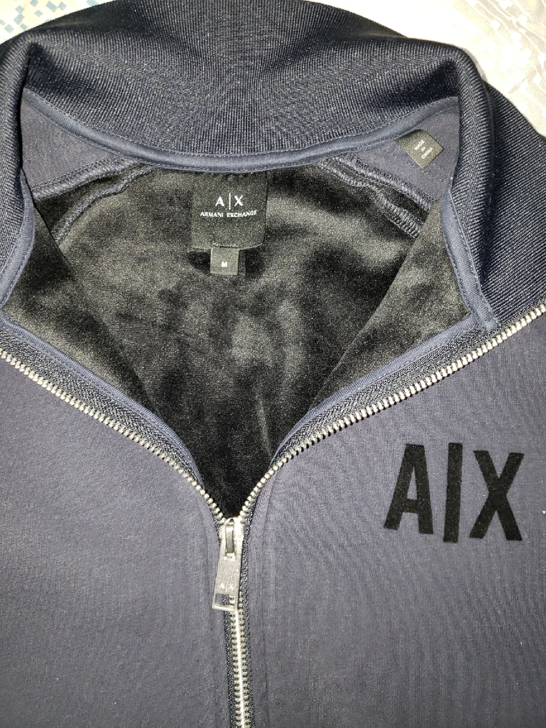 Selling an Armani Exchange track jacket in size medium. It's in great condition and features the AIX logo on the front. The back has the full ARMANI EXCHANGE logo. Perfect for casual wear or workouts!