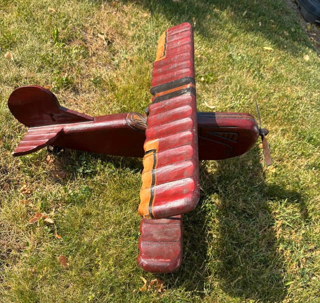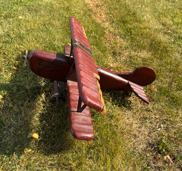 Vintage toy biplane. Wood with metal propellor, wing supports and wheels. Measurements: 30” Wide Wing Span 27” Long Tail To Propeller 13” Tall Roughly 11.5LBS