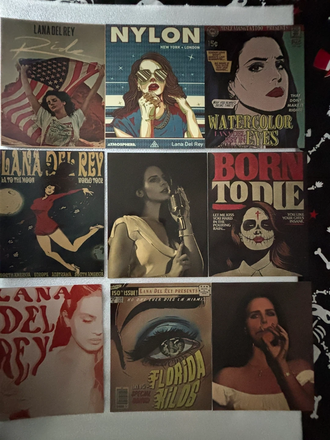 Selling a set of 9 Lana Del Rey posters! Each poster features a unique design, including album art and promotional images. They're perfect for any Lana fan looking to add some personality to their space. The set includes designs like 'Ride', 'Nylon', 'Watercolor Eyes', 'Born to Die', and 'Florida Kilos'.