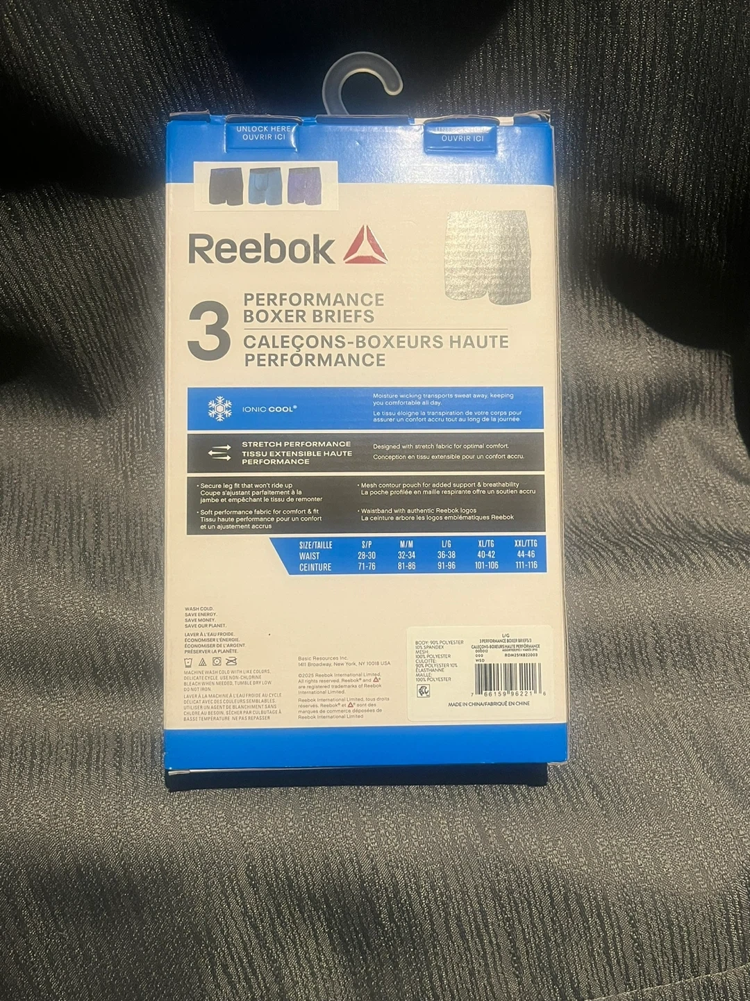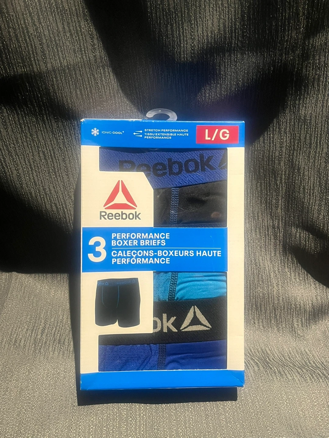 1000+Get three pairs of Reebok Performance Boxer Briefs in size L/G! These briefs are designed with stretch fabric for optimal comfort, ensuring a secure fit that won't ride up. They also feature an ionic cool design to wick away moisture, keeping you comfortable all day long. The box is included
