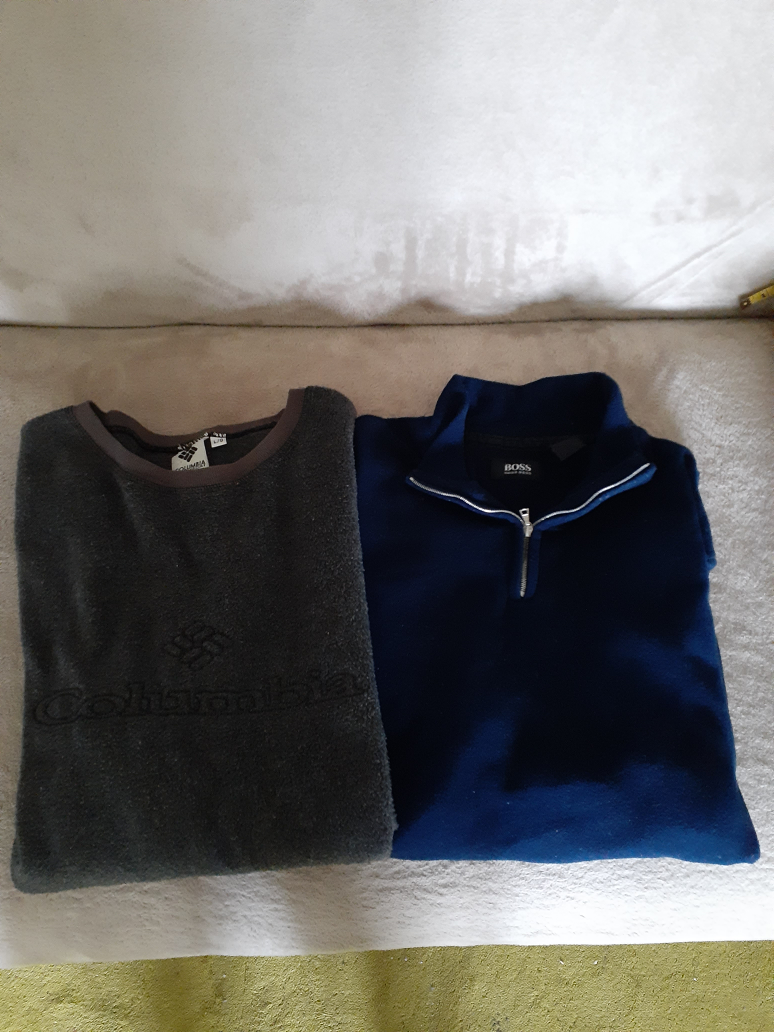 Here are 2 mens fleece tops. The first is a Columbia grey fleece top. The second is a Hugo Boss navy blue fleece top with a quarter zipper.