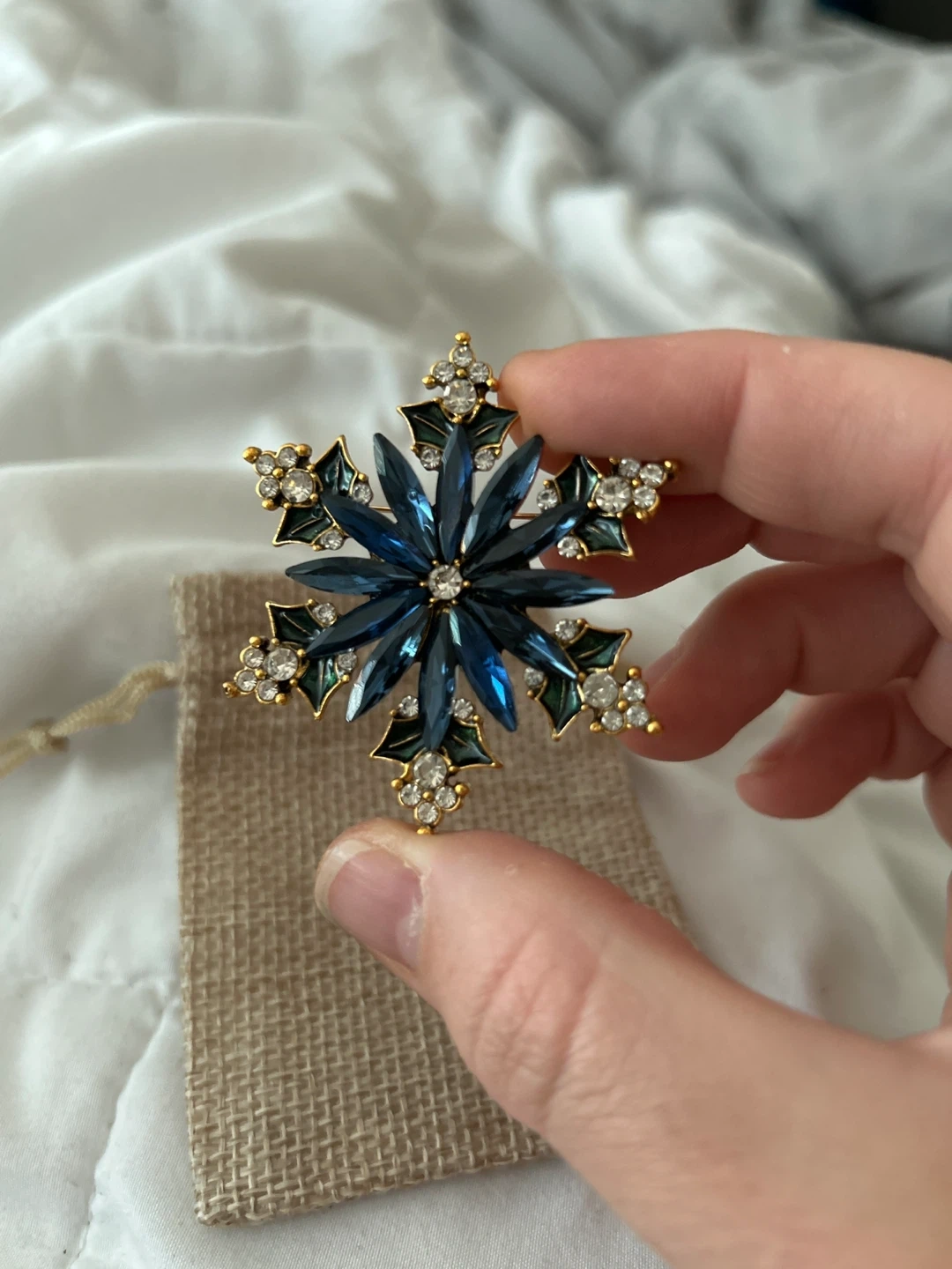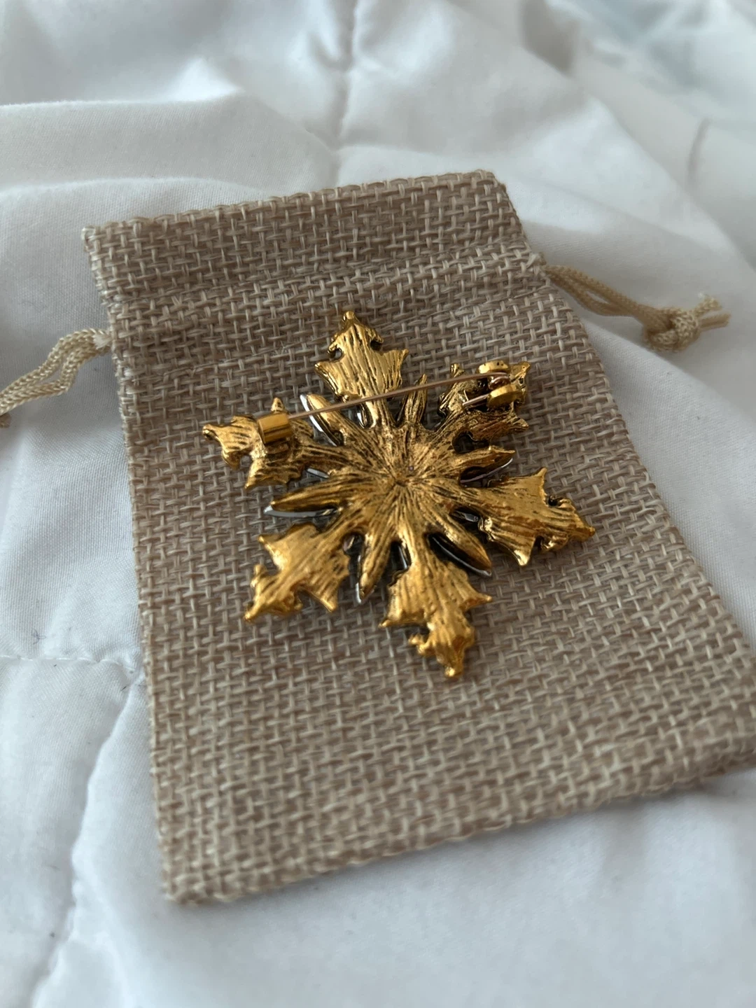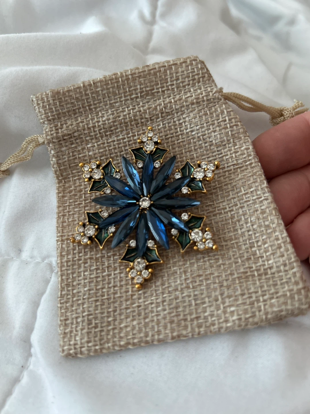 90Beautiful snowflake brooch pin with blue and gold accents! This lovely pin is perfect for adding a touch of elegance to any outfit. It comes with a small burlap bag for safekeeping