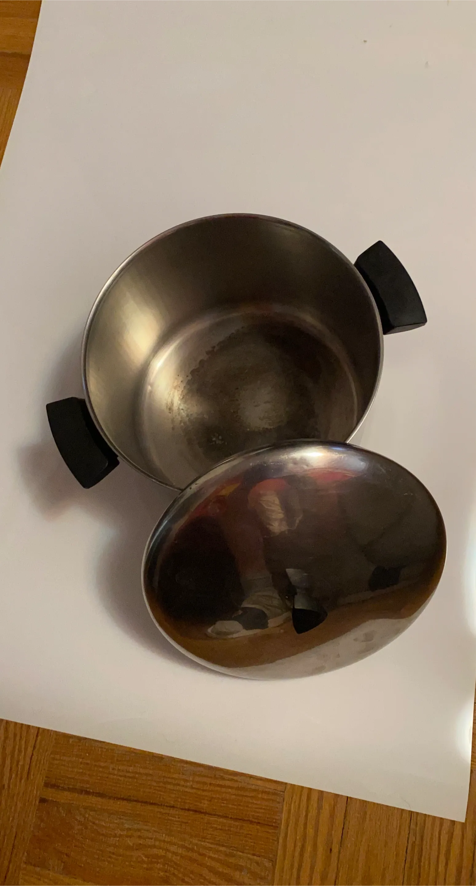 Selling a stainless steel pot with a lid. It has black handles on the side. Great for cooking up your favourite meals!