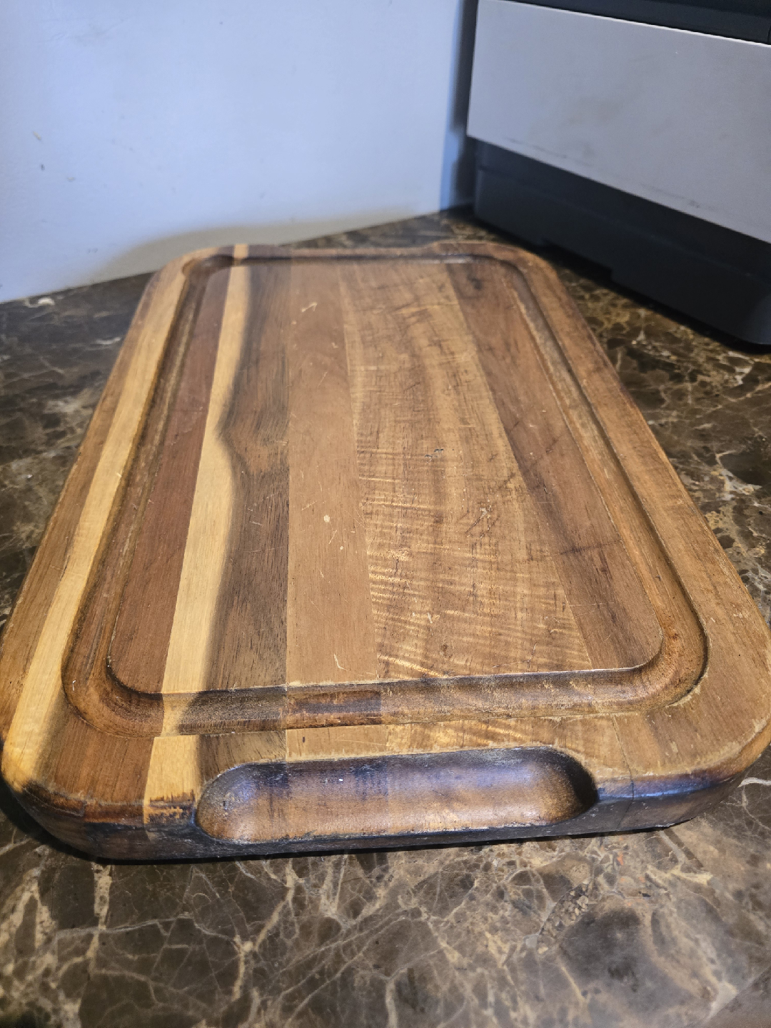 Selling a wooden cutting board. It's in decent condition, perfect for everyday kitchen use! It has a handle and a groove around the edge. or as a cheese platter board