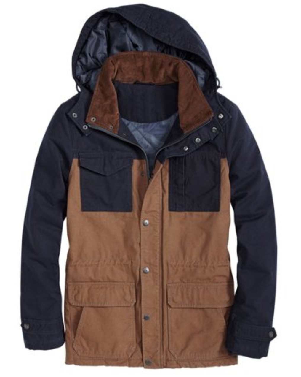 Removable snap buttoned hood.