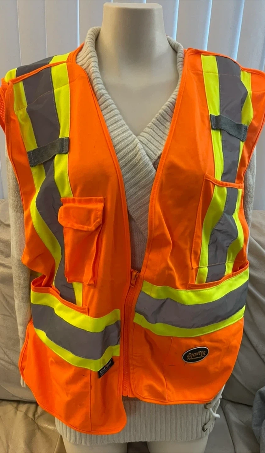 Selling a Pioneer hi-visibility safety vest in orange. It has reflective stripes and multiple pockets for your convenience. Perfect for construction, road work, or any job requiring high visibility!