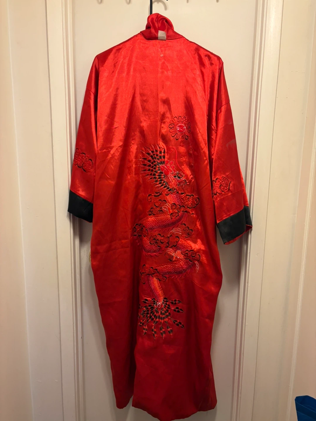 58A beautiful red robe featuring a dragon embroidery design! It's in great condition and would be a lovely addition to your wardrobe or as a unique gift. The robe has black accents and a comfortable, flowing fit