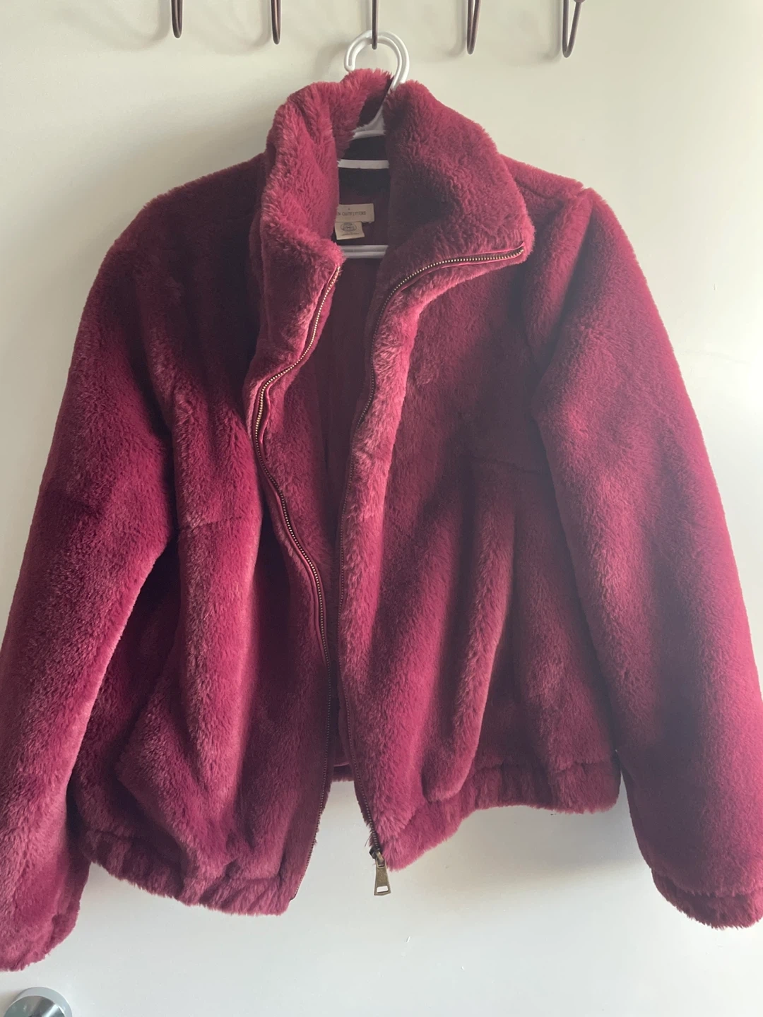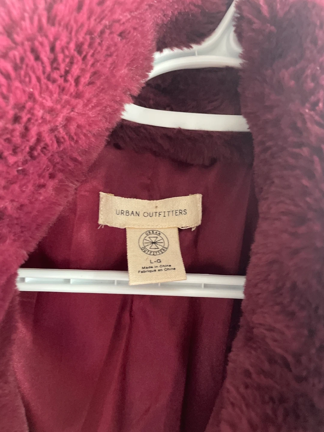 607Selling a cozy faux fur jacket from Urban Outfitters! It's a lovely burgundy colour and in great condition. It's a size large and perfect for adding a bit of warmth and style to your outfit during the cooler months