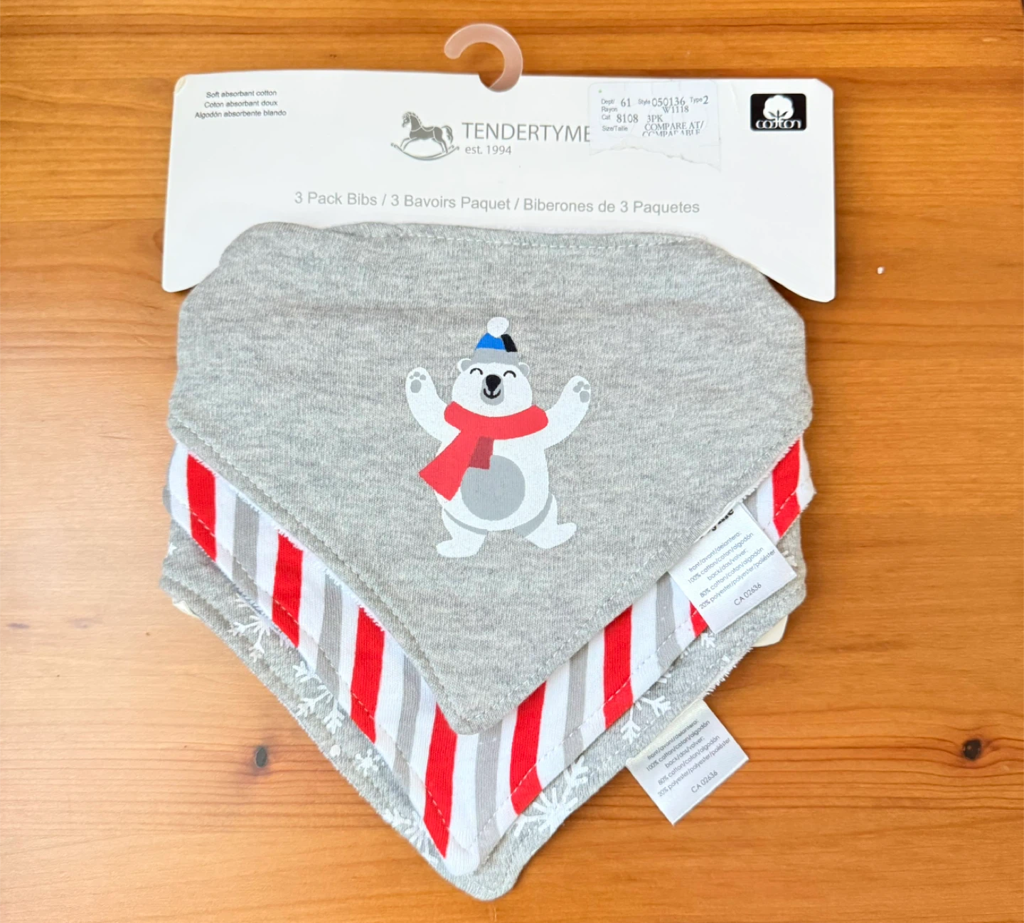 Here's a brand new pack of TenderTyme baby bibs! They come in a pack of three and feature a cute polar bear design.