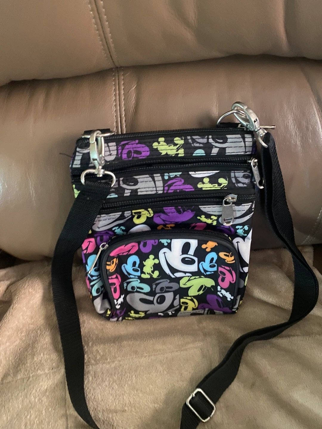 52Super cute crossbody bag featuring Mickey Mouse designs! It has a black adjustable strap and several zippered compartments to keep your belongings organized. Perfect for everyday use or a trip to Disneyland!