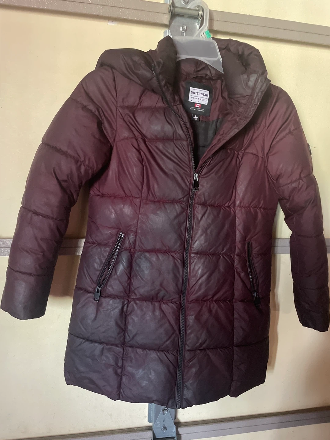 144Cozy Point Zero outerwear puffer jacket in a lovely dark red colour. It's a size large and perfect for keeping warm during the colder months. Great for everyday wear!