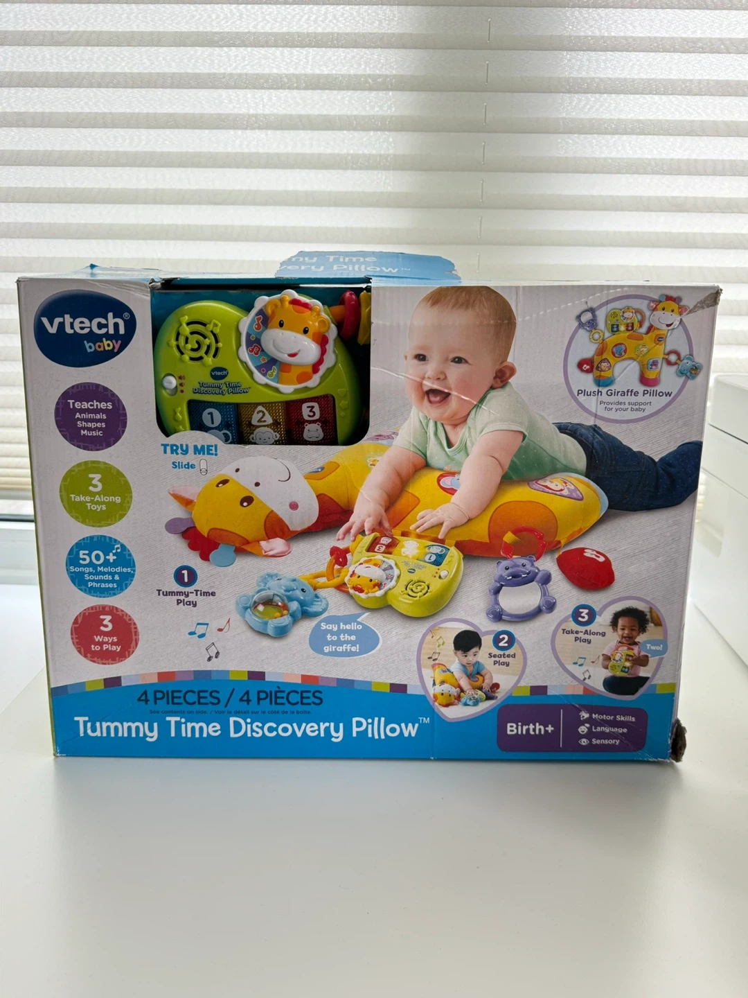 10Selling a brand new VTech Baby Tummy Time Discovery Pillow, still in its original packaging! This set includes a giraffe discovery pillow, an electronic piano, a mirror, and a rattle. It's designed to help with motor skills, language development, and sensory stimulation for your little one. Features include playful songs, animal sounds, and bright, flashing lights to visually stimulate your baby