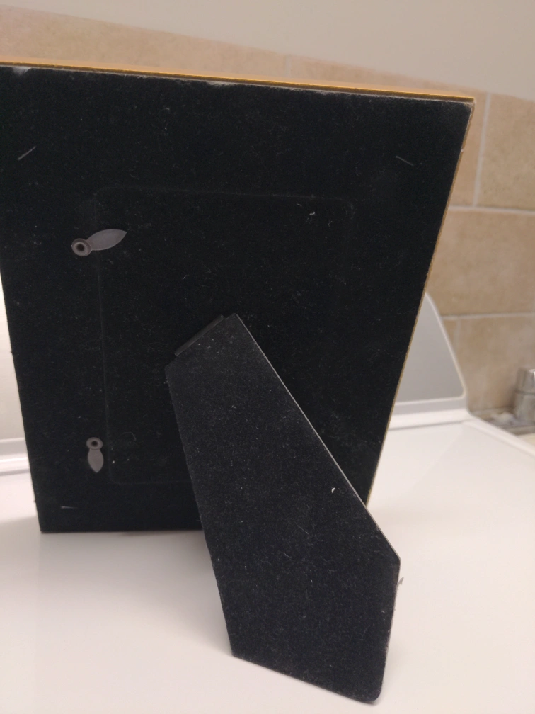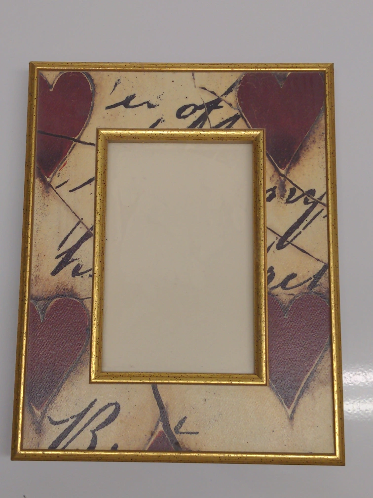 A decorative picture frame with a heart pattern design. It features a gold-tone border and a stand on the back for easy display. Perfect for adding a touch of warmth to any room! 4x6 picture.