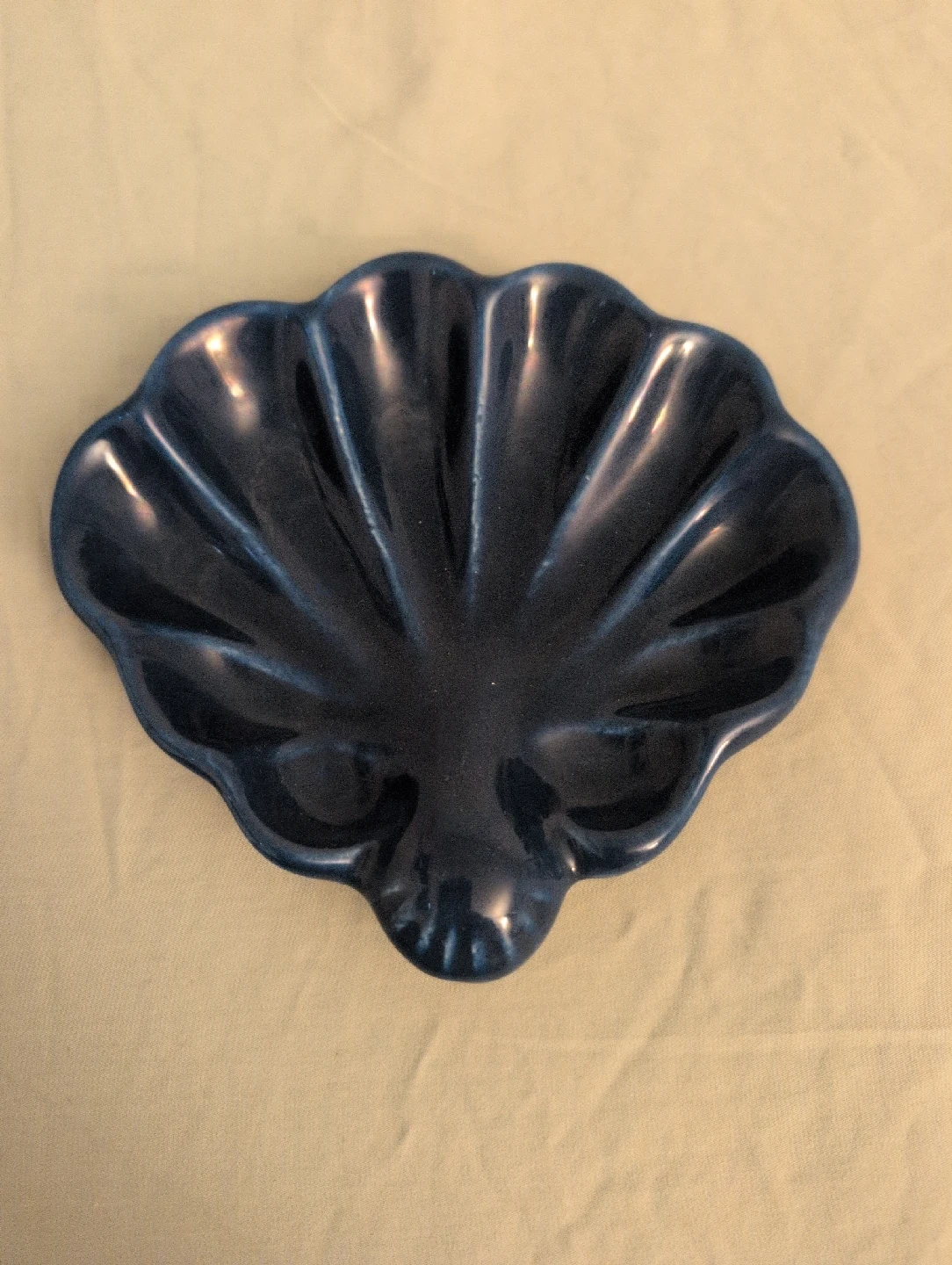A lovely blue seashell-shaped trinket dish! Perfect for holding small items like jewelry, keys, or coins. It's in great condition and ready to add a touch of seaside charm to your home