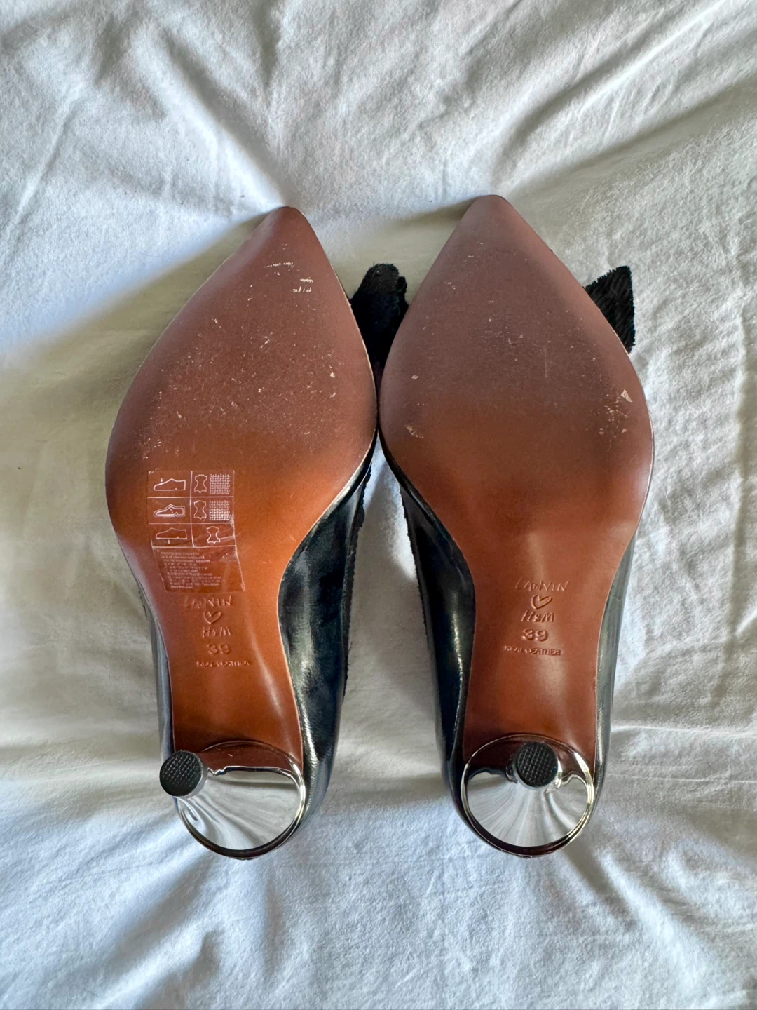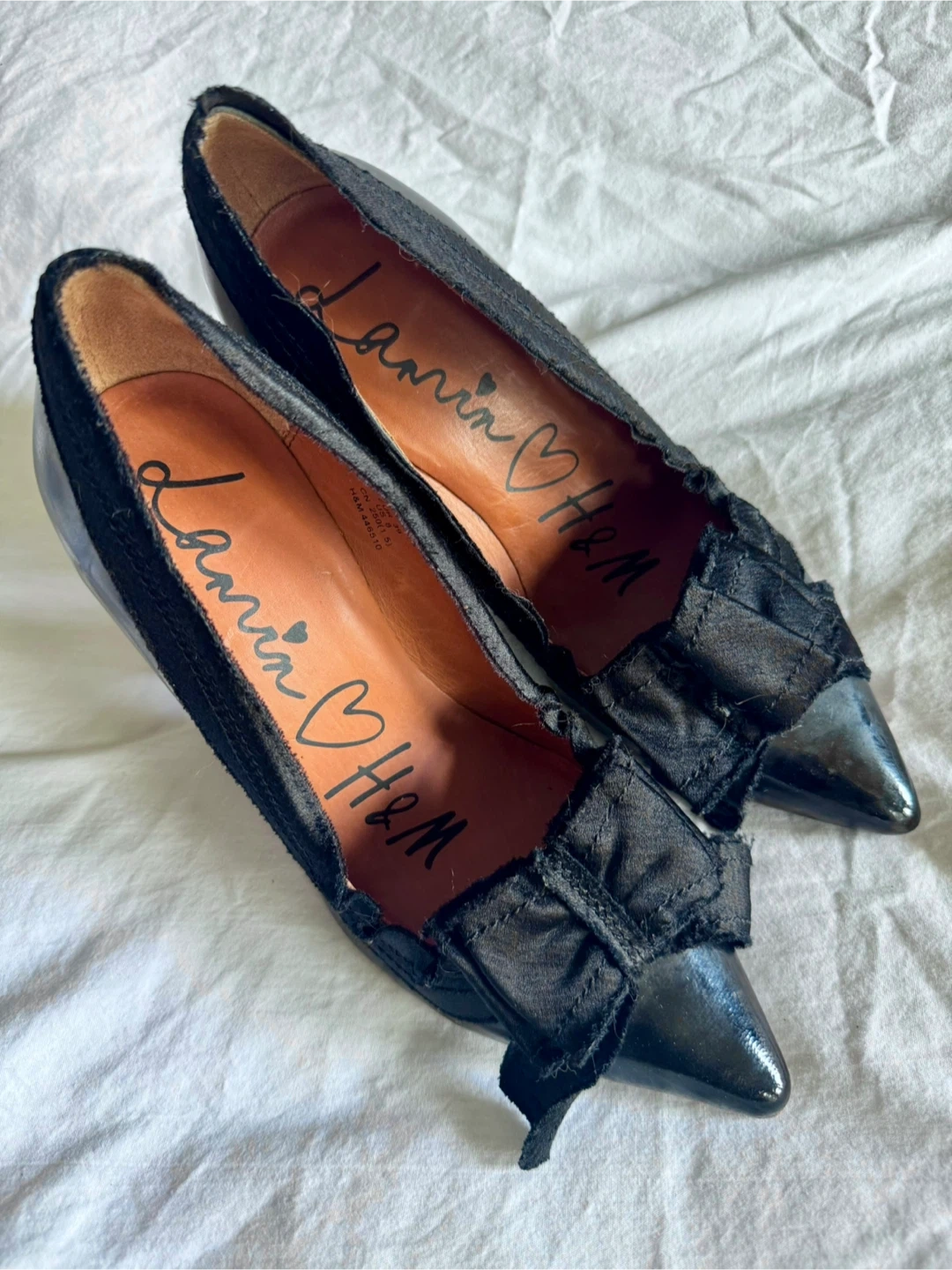 Very gently used, authentic Lanvin x H&M black patent leather heels with pointed toes and satin ribbon trim and bow. Shiny silver heels. QSize 39 but fits about a size small. No scuffs, stains or tears. Minimal signs of wear.