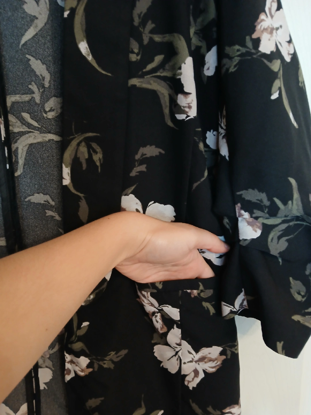 Colour: black with greyish, white and greenish hued floral