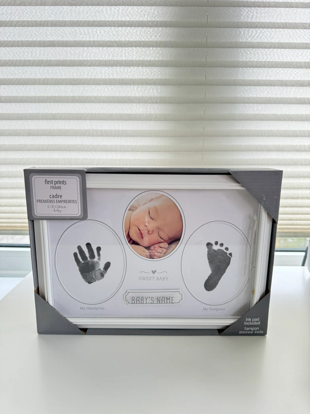 10Capture your little one's precious handprint and footprint with this Pearhead Firstprints frame! It includes a non-toxic, washable black ink pad and instruction sheet to help you create a lasting keepsake. The frame is perfect for displaying your baby's handprint, footprint, and a sweet photo. It's a wonderful way to cherish those early memories.