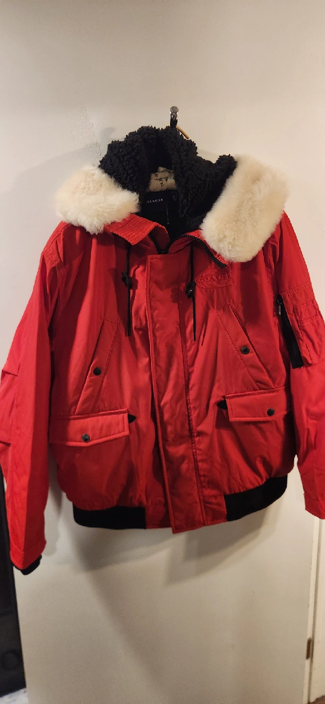 Selling a bright red Coach winter bomber jacket! It's brand new without the tags. Ready to keep you warm this winter. The jacket features a cozy black sherpa lining and a stylish faux fur hood. Perfect for braving the Canadian cold!
