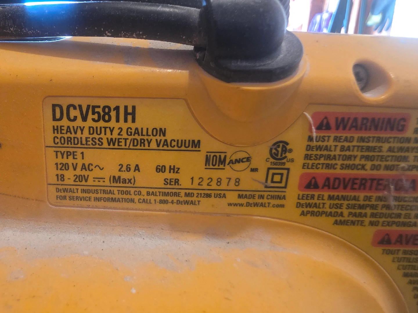 59Selling a DeWalt DCV581H Heavy Duty 2 Gallon Cordless Wet/Dry Vacuum. It's in good working condition and ready to help with your cleaning needs! It operates on 120 V AC and 18-20 V DC. Perfect for small spills and messes!