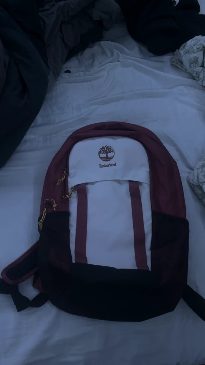 Selling a Timberland backpack. It's in great shape and ready for a new owner! The backpack features a burgundy, white, and black colour scheme and the Timberland logo.