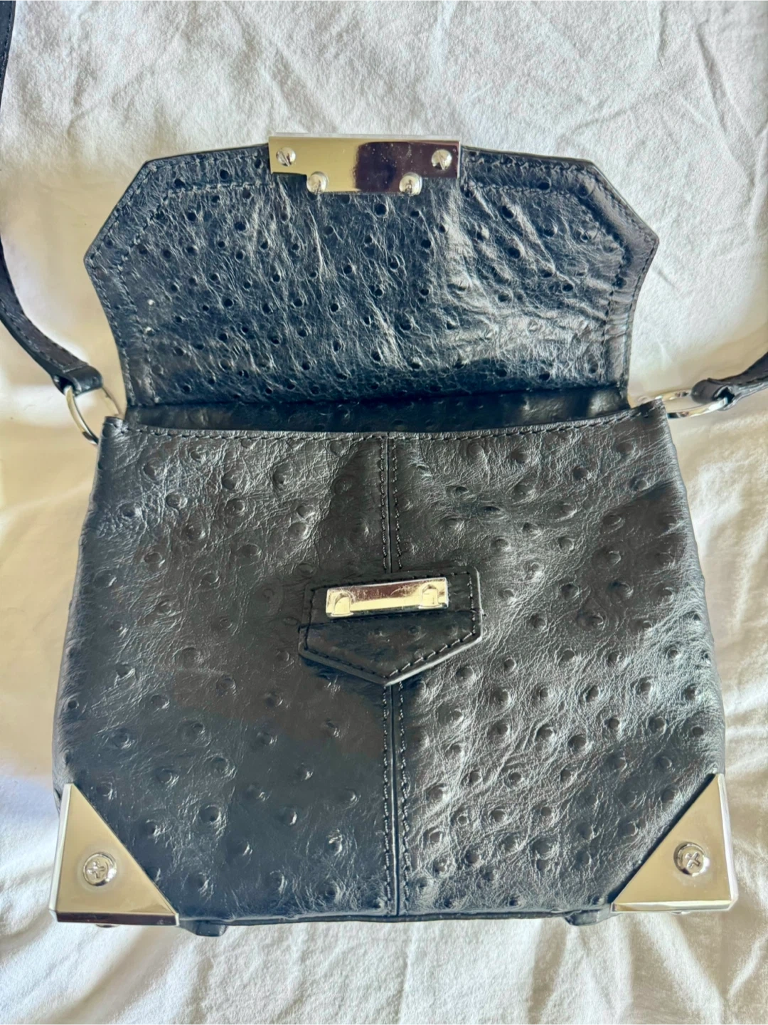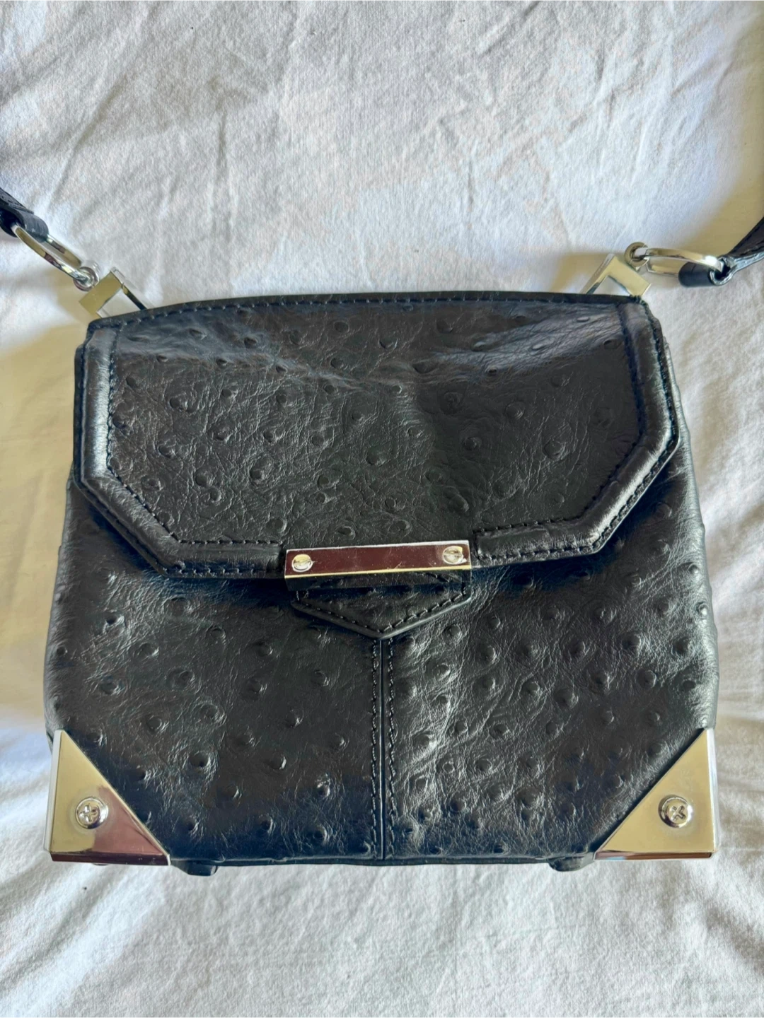 Authentic/pre-owned Alexander Wang Marion Black Leather Shoulder Crossbody Purse with flap closure and silver hardware and metal corners. Pristine, just like new condition.