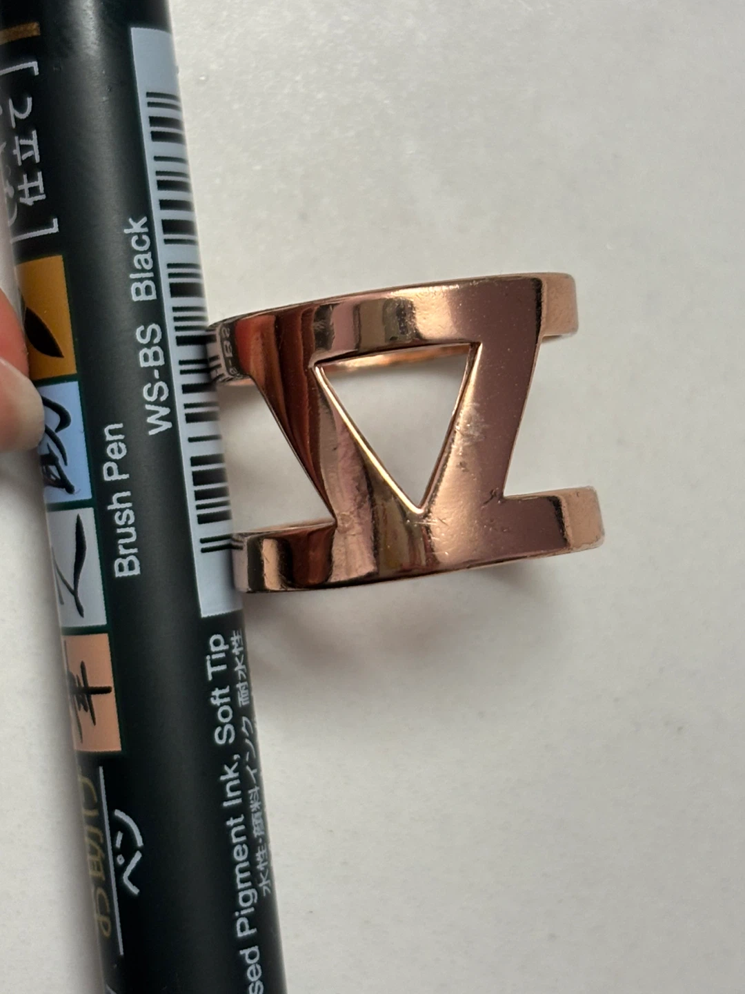 Ring with a V/triangle motif. I’m not sure if it’s size 7 or 7.5 i bought it years ago and don’t have a ring sizer. Stamped .925 and plated with rose gold, has some scratches, plating looks like it’s starting to wear off (brush pen not included)