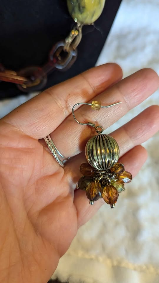 Matching dangle earrings with gold ribbed beads and amber crystal clusters complete the look.