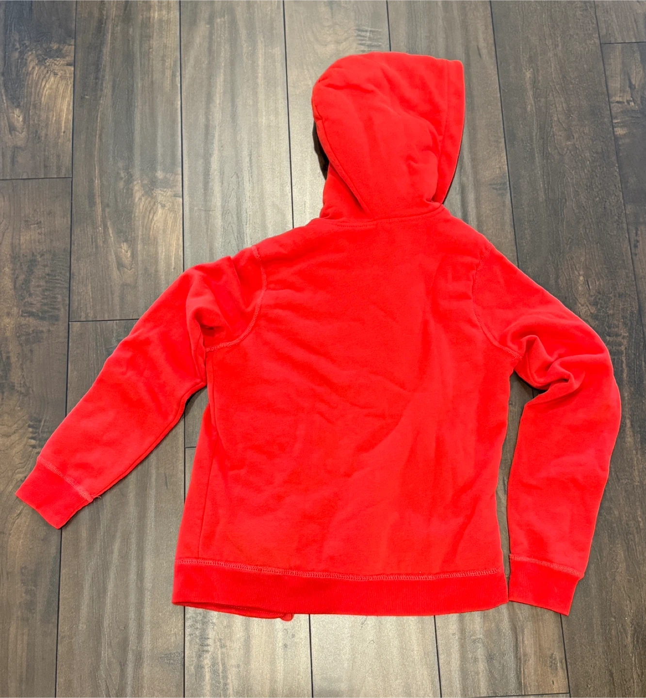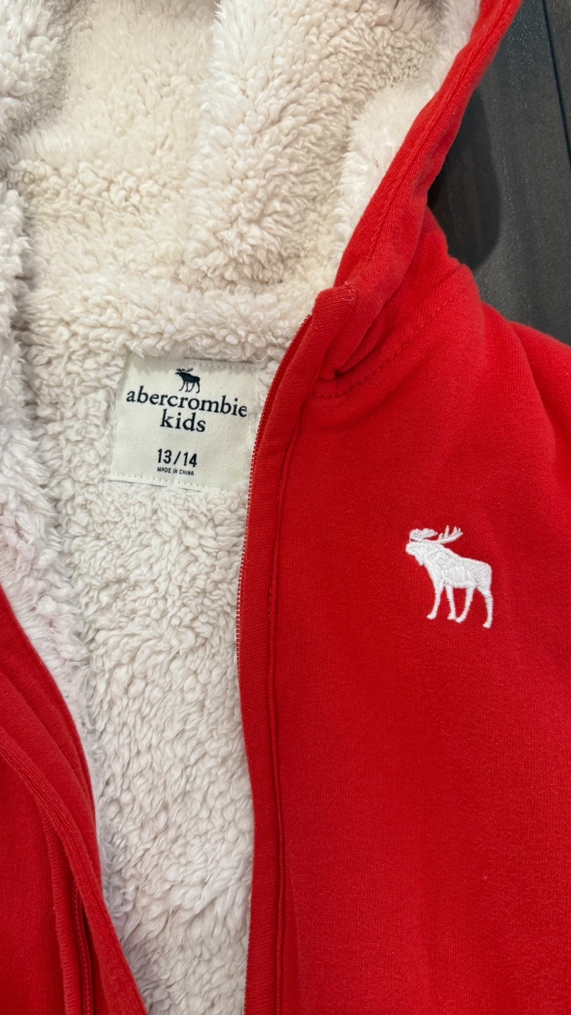 18Cozy up with this Abercrombie Kids hoodie! It's a bright red colour and features a soft, sherpa lining, perfect for keeping warm. The size is 13/14, great for kids or teens. It has the classic Abercrombie moose logo on the chest