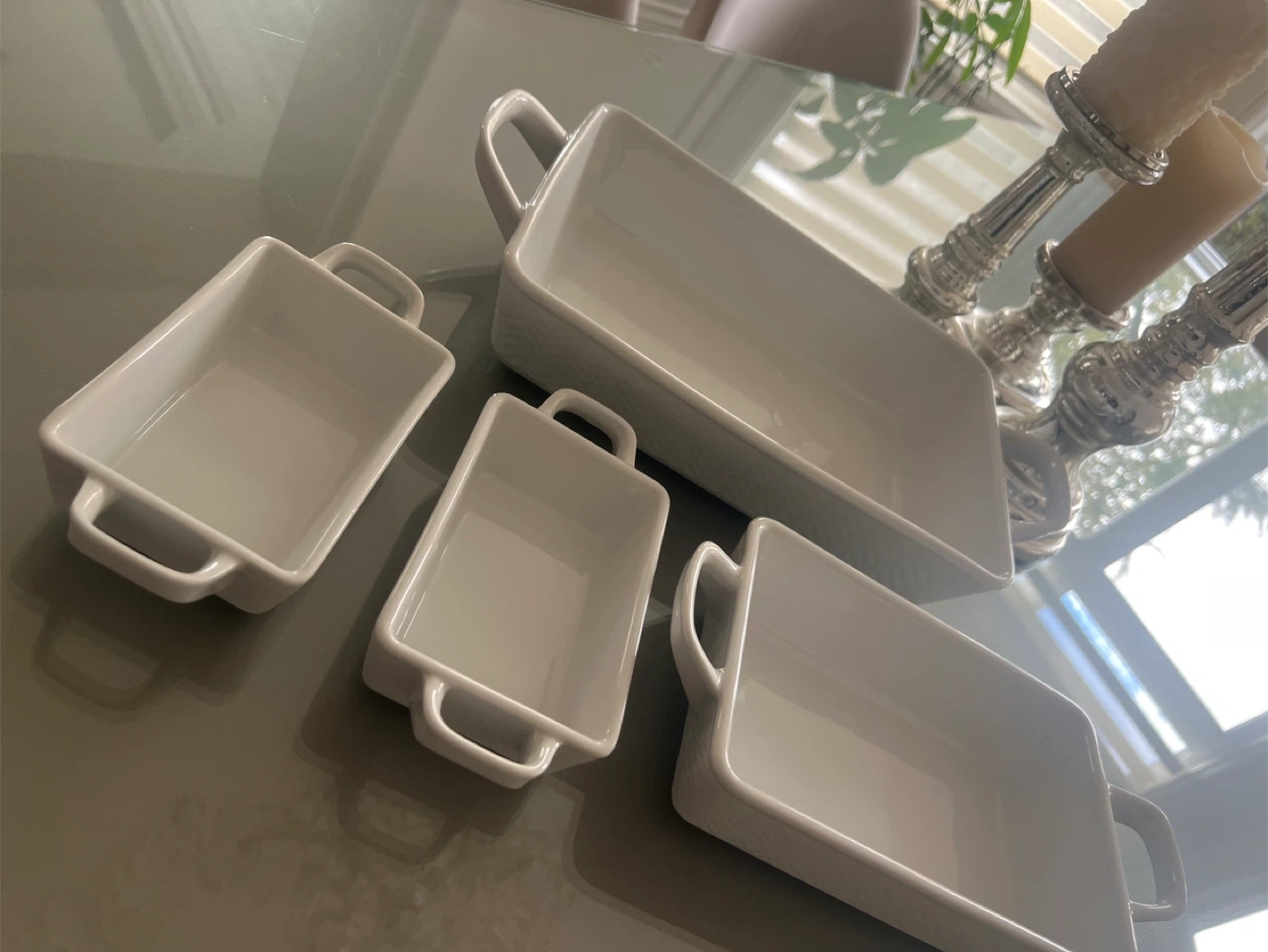 218Selling a set of four Canvas brand white baking dishes. They are in great condition and perfect for all your baking needs! The set includes various sizes to accommodate different recipes. Add a touch of elegance to your kitchen with these stylish and functional baking dishes