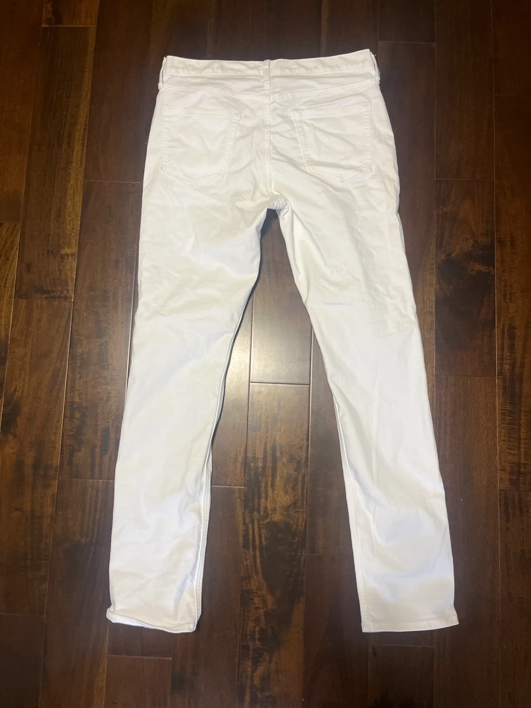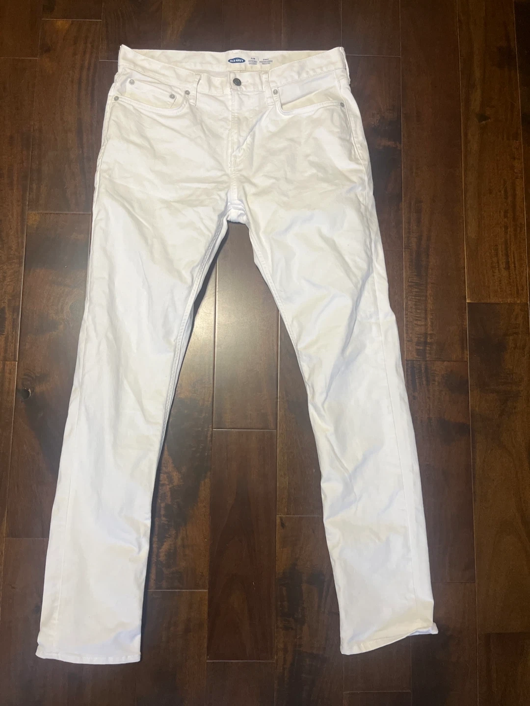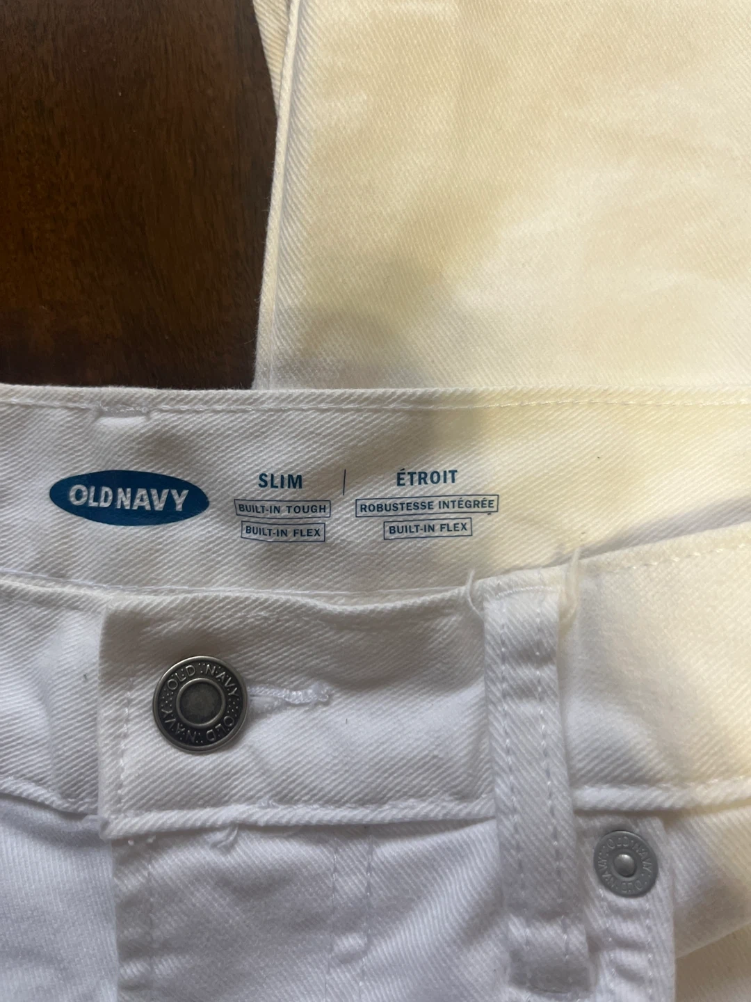 Selling a pair of Old Navy slim fit jeans in white. These have the built-in flex for extra comfort and are in great condition! They're perfect for a casual look or dressing up a bit