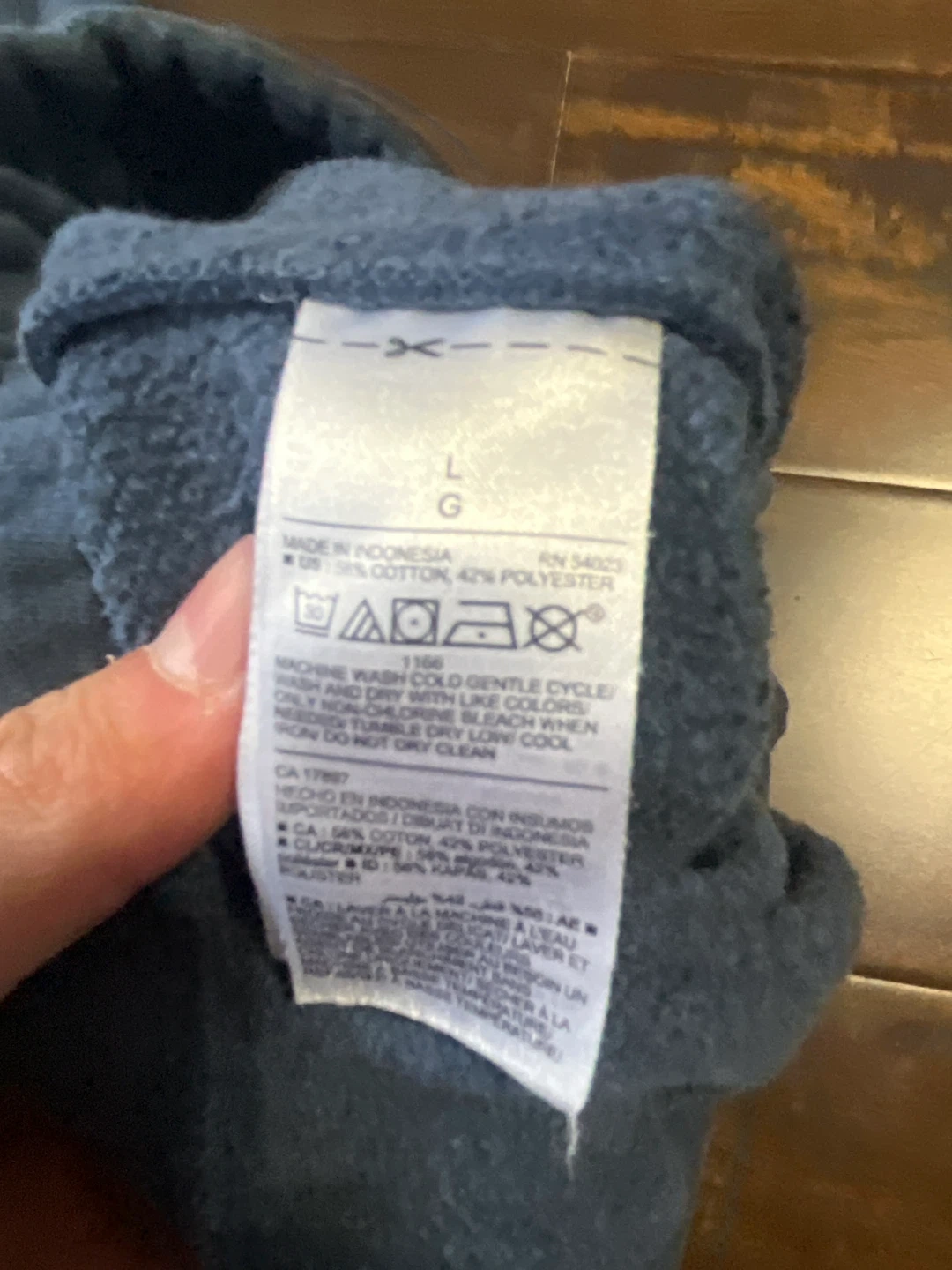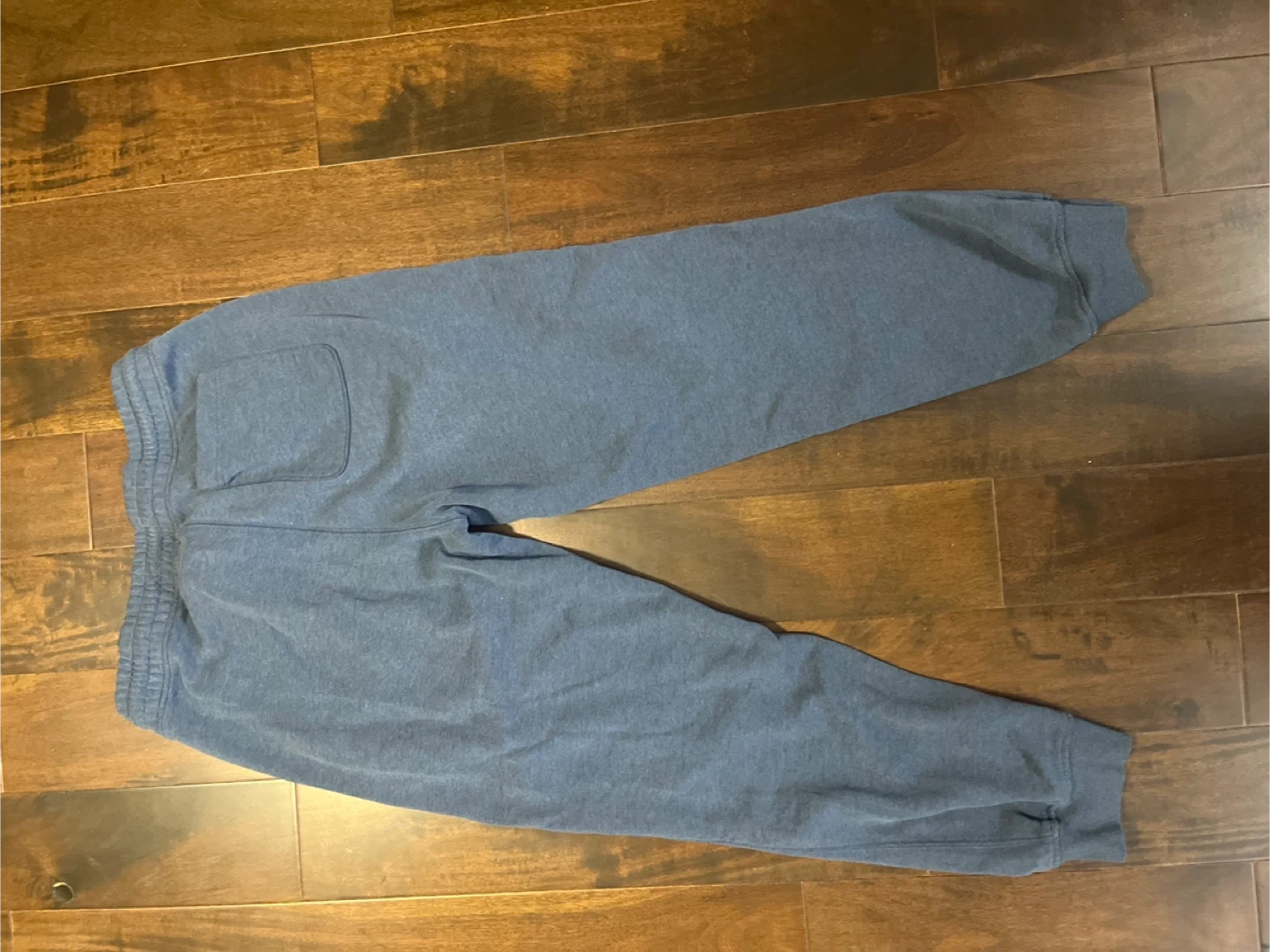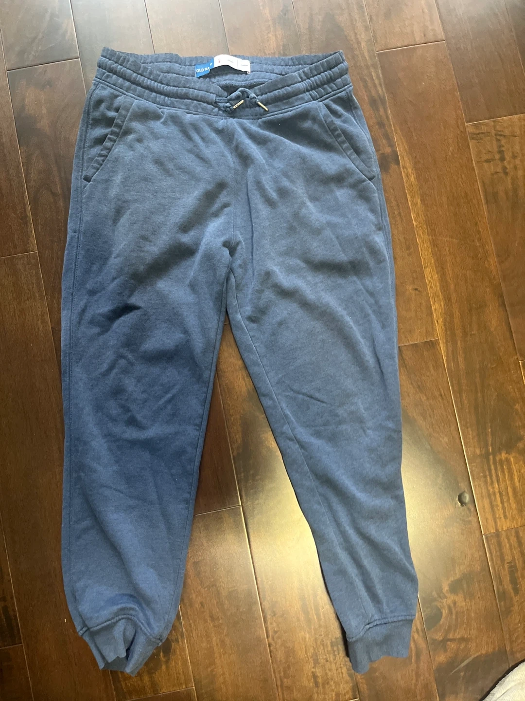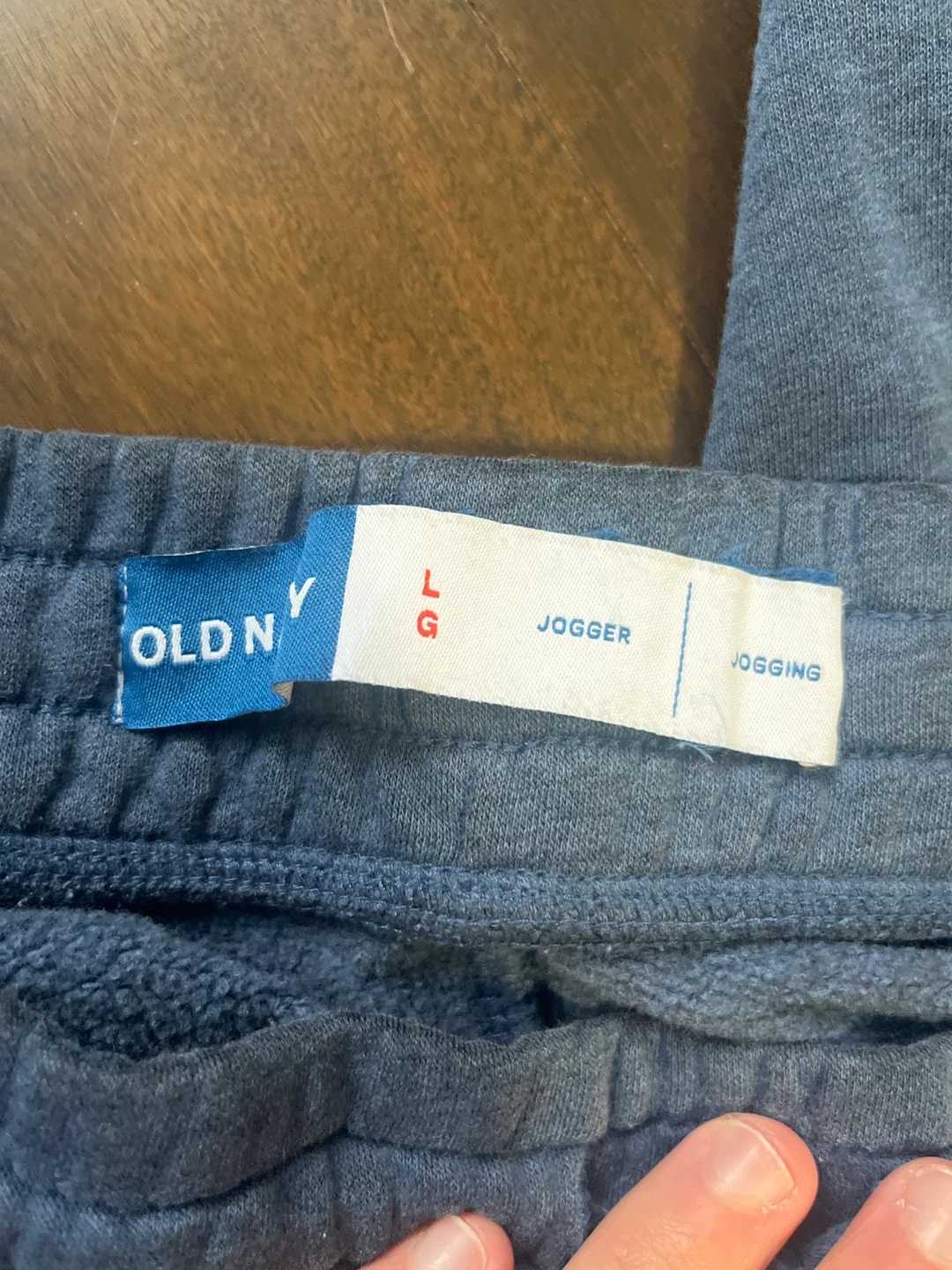 Selling a pair of comfy Old Navy jogger pants in a nice blue colour! They are a size large and made of 58% cotton and 42% polyester, so they're soft and easy to care for. Perfect for lounging around or running errands!