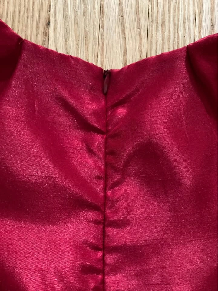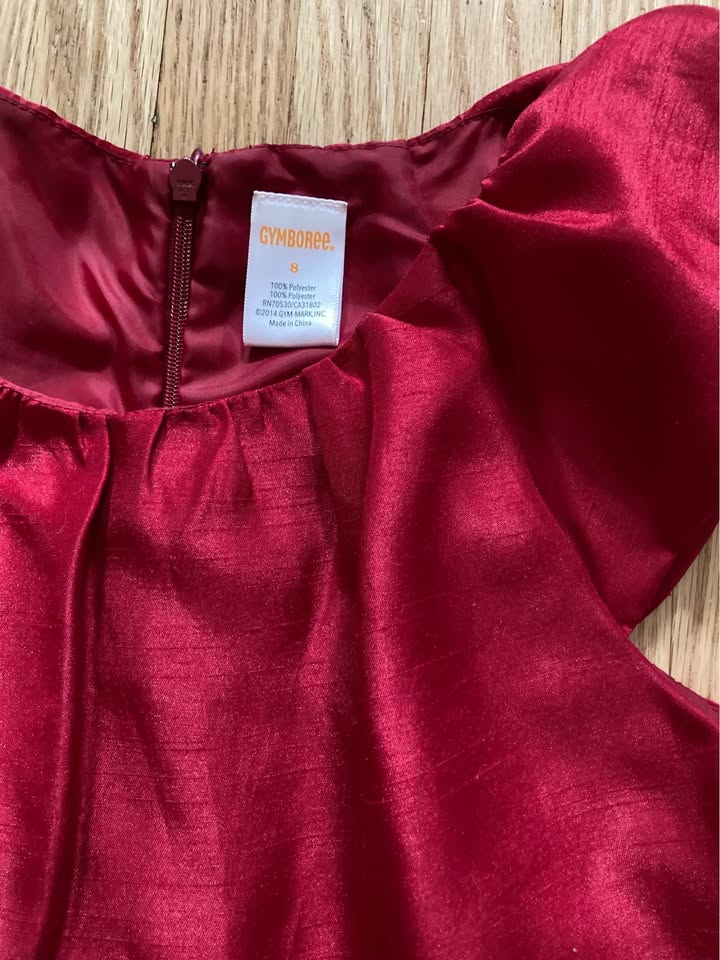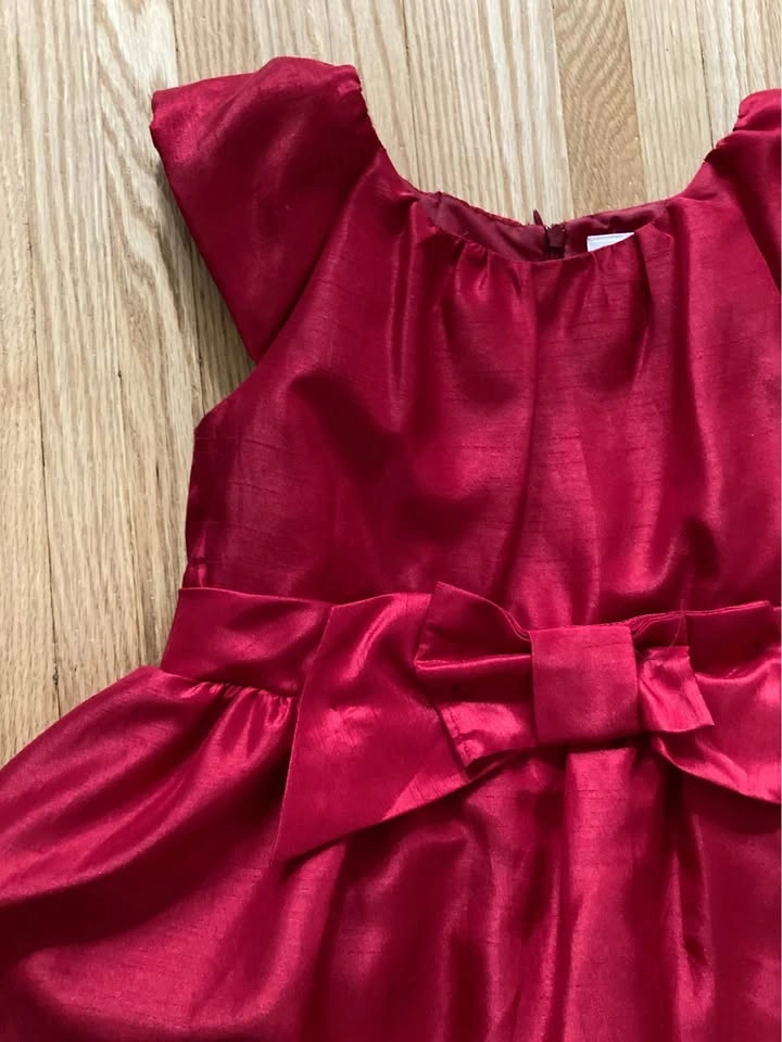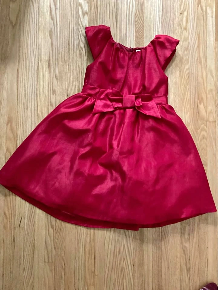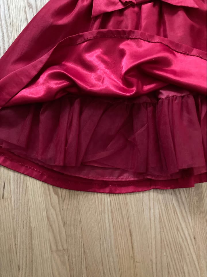 The top of the dress has short almost cap sleeves with a small bit of poof. There is a bow around the waist and crinoline under the skirt with a slip under that so the dress is comfy for the kids to wear all night long. Dress unzips at the back by a hidden zipper.