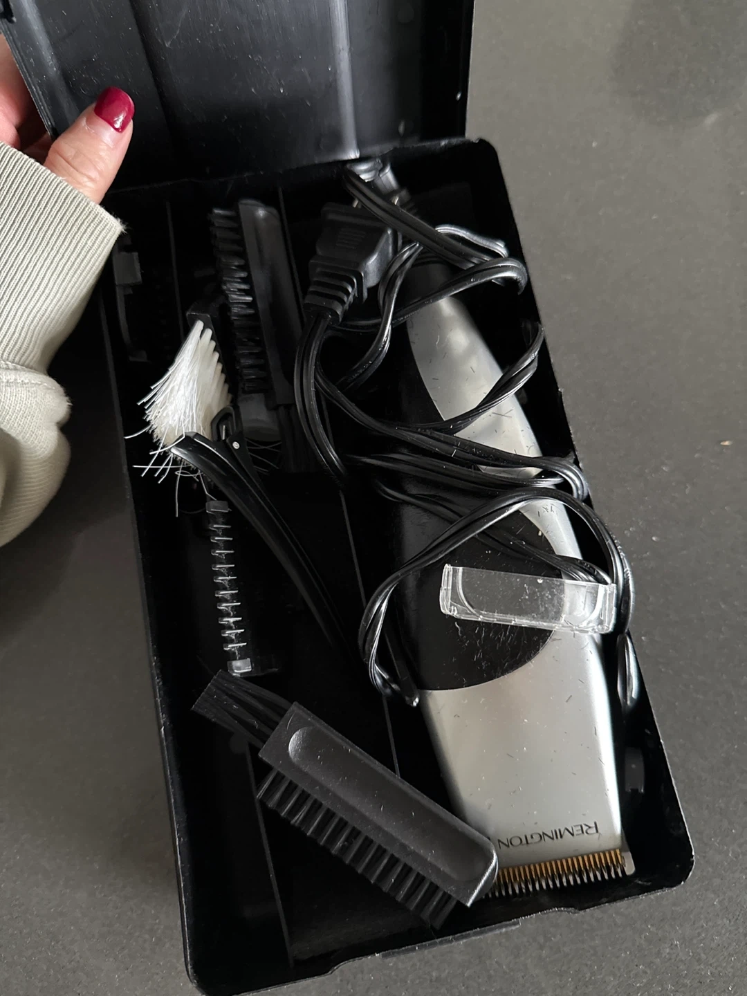 Remington hair clipper. It comes with its original case and various attachments, including cleaning brushes. Perfect for at-home haircuts! Needs a good cleaning but fully functional