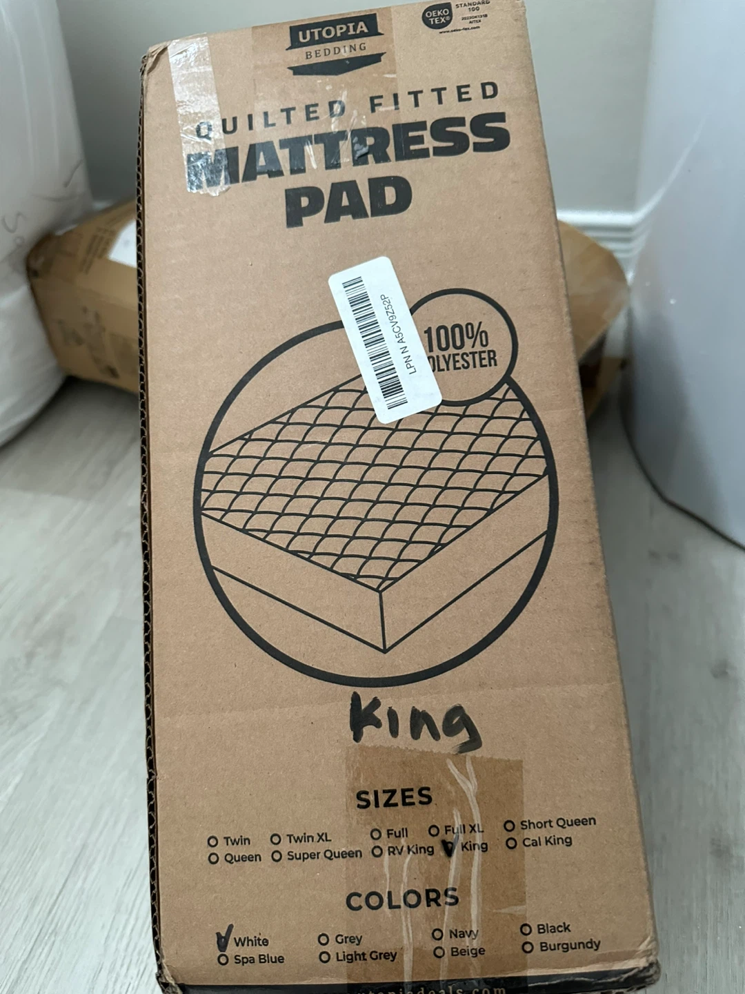 Selling a Utopia Bedding quilted fitted mattress pad in King size. It's white and made of 100% polyester. Perfect for adding extra comfort to your bed!