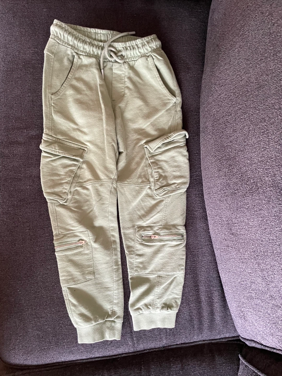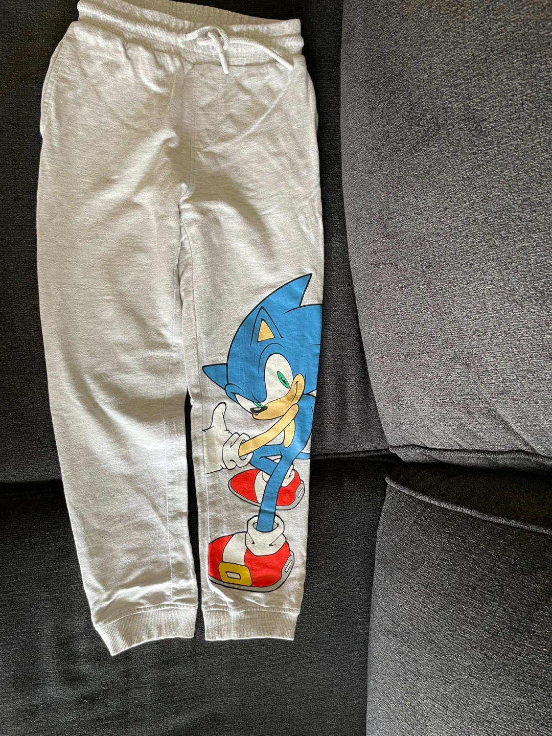 Selling a couple of pairs of kids' pants. One is a pair of green cargo pants with lots of pockets, and the other is a pair of grey joggers with a Sonic the Hedgehog graphic on the leg! Both are in great condition.