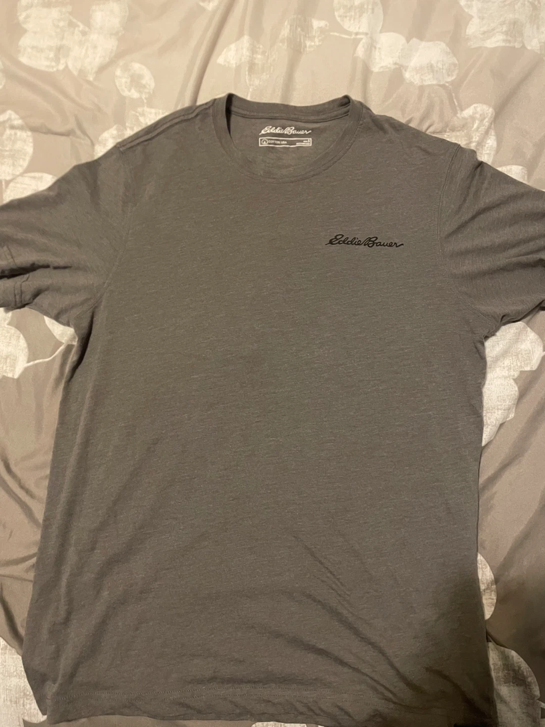 Selling a gently used Eddie Bauer men's t-shirt in size small. It's a grey colour with a cool graphic on the back featuring a fisherman and the Eddie Bauer Outdoor Outfitters logo. The front also has the Eddie Bauer logo embroidered on it. Made of cotton USA!